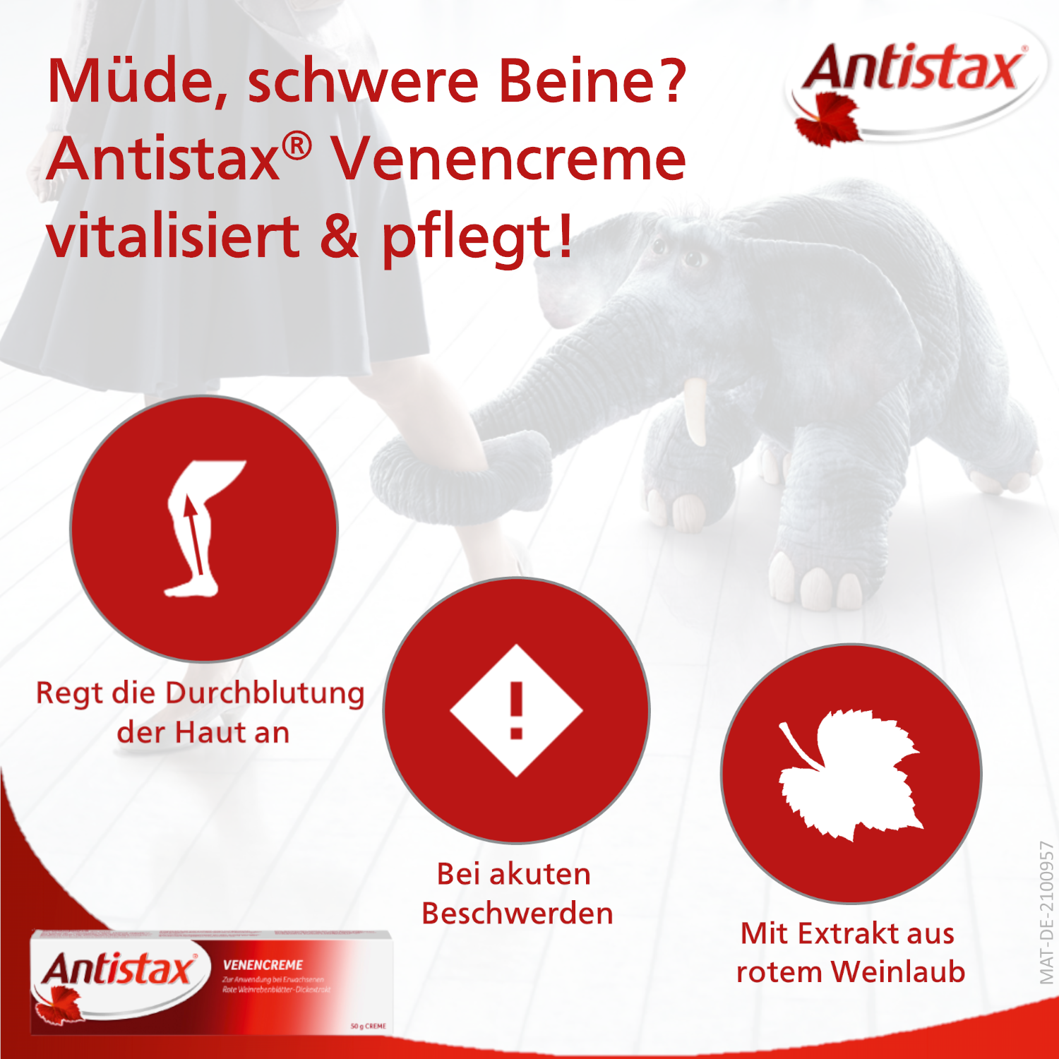 Antistax® Venencreme. Wirkstoff: Dickextrakt aus roten Weinrebenblättern. Anwendungsgebiet: Traditionell angewendet bei Erwachsenen zur Linderung von Beschwerden und Schweregefühl der Beine im Zusammenhang mit leichten venösen Durchblutungsstörungen. Hinweis: Enthält Cetylstearylalkohol und Propylenglycol. Packungsbeilage beachten.