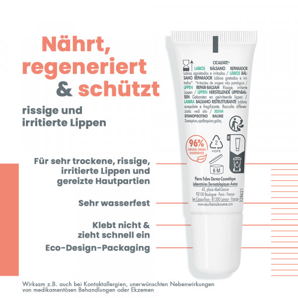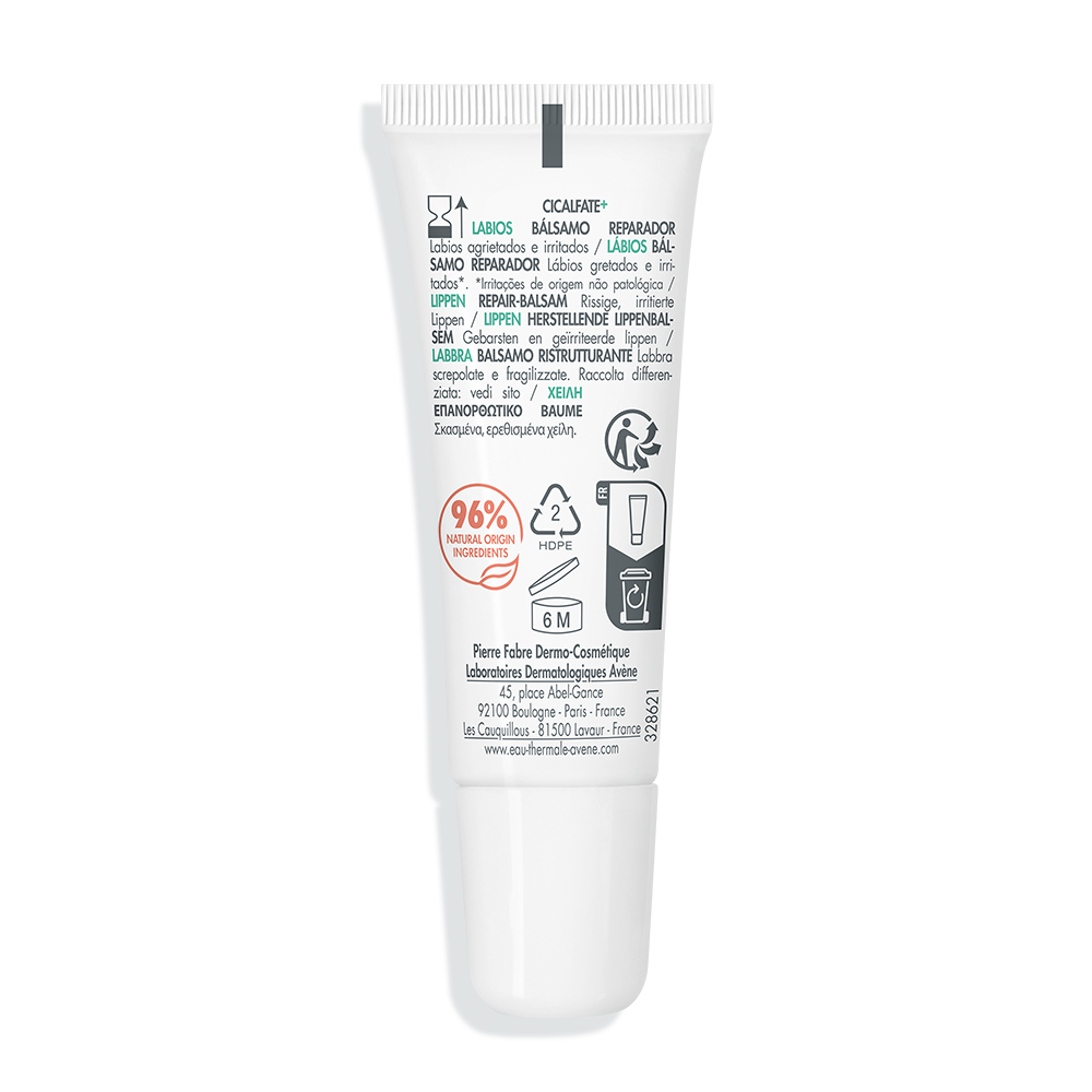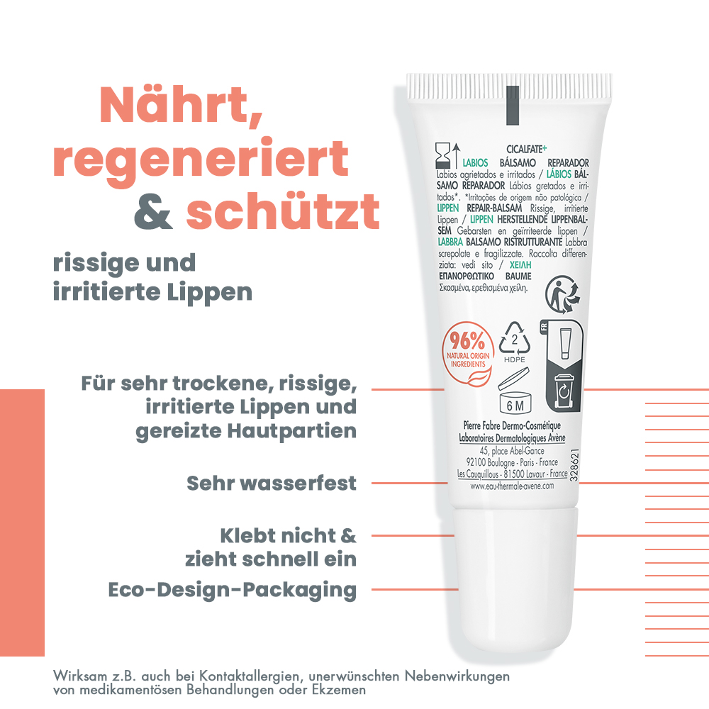 Die neue Formulierung des Cicalfate+ LIPPEN Repair-Balsams regeneriert spröde, sehr trockene, rissige und gereizte Lippen innerhalb von 48 Stunden*. Sie ist sehr wasserfest, schützt, spendet 24 Stunden lang Feuchtigkeit und pflegt intensiv. Die mit [C+-Restore]™, einem postbiotischen, reparierenden Aktivstoff, und Avène Thermalwasser angereicherte Zusammensetzung beruhigt die Lippen und sorgt für eine schützende Barrierewirkung. Dieses Pflegeprodukt für die ganze Familie besteht zu 96 % aus Inhaltsstoffen natürlichen Ursprungs und sorgt schon bei der ersten Anwendung für Wohlbefinden und Geschmeidigkeit. Die Verpackung ist umweltfreundlich gestaltet: Sie besteht zu mindestens 24 % aus recyceltem Material. *Verträglichkeits- und Wirksamkeitsstudie unter dermatologischer Kontrolle an 38 Probanden, Anwendung viermal täglich über 21 Tage.