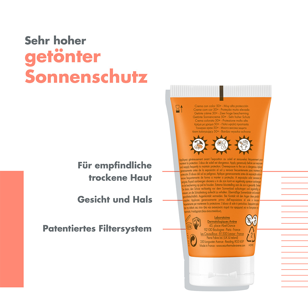 Die Avène Getönte Sonnencreme SPF 5+ enthält das erste Filtersystem mit HEV Blue Light Filter aus der Pierre Fabre Forschung. Das innovative Filtersystem filtert neben UVB- und UVA-Strahlung auch HEV Blue Light und beugt somit Hautalterung und Hyperpigmentierung vor.