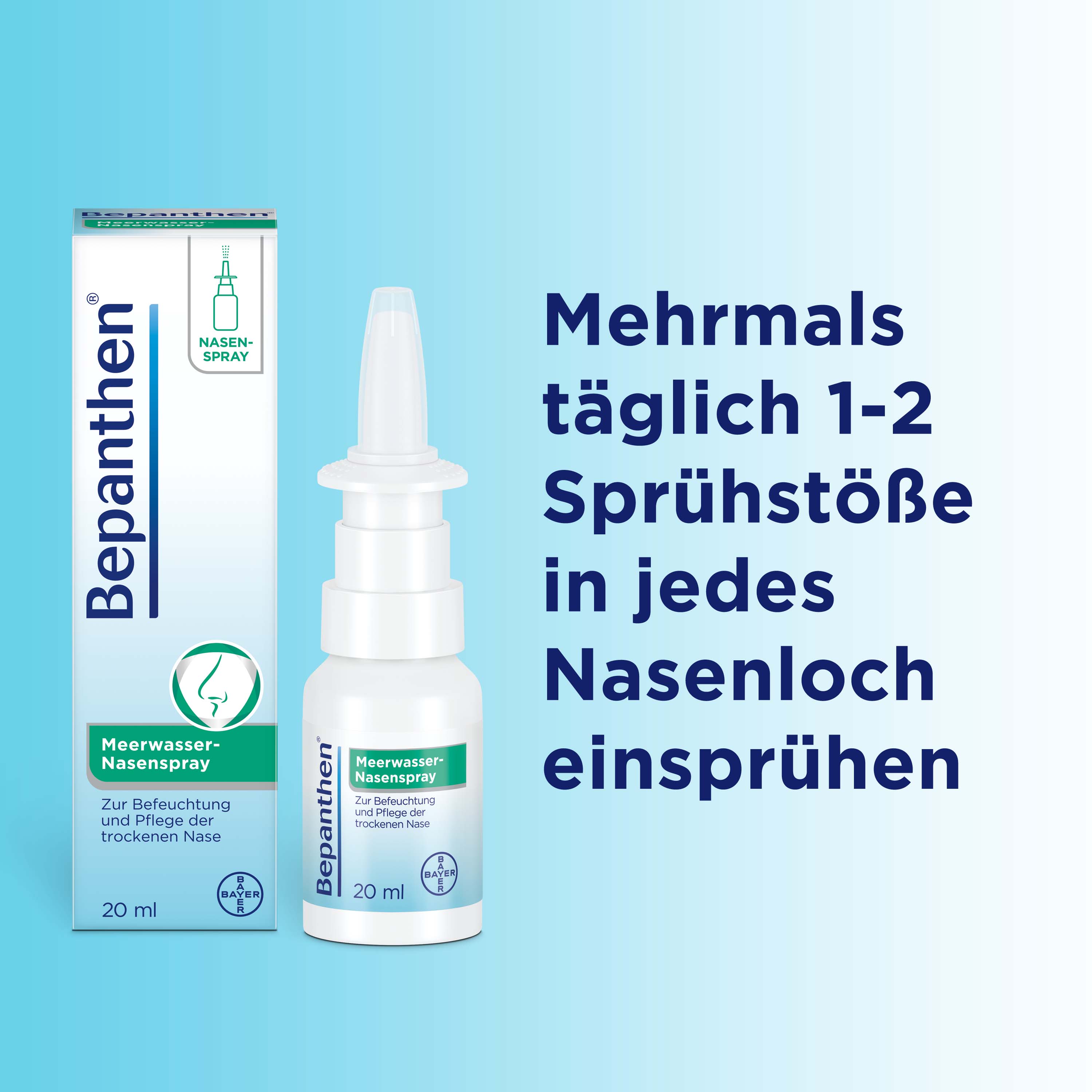 Bepanthen Meerwasser-Nasenspray hilft schnell und wirksam bei trockener Nase und als begleitende Maßnahme bei Erkältung oder Heuschnupfen. Bepanthen Meerwasser-Nasenspray befeuchtet, reinigt und pflegt die Nase und sorgt mit Meerwasser natürlichen Ursprungs und Dexpanthenol für eine gesunde Nasenschleimhaut.