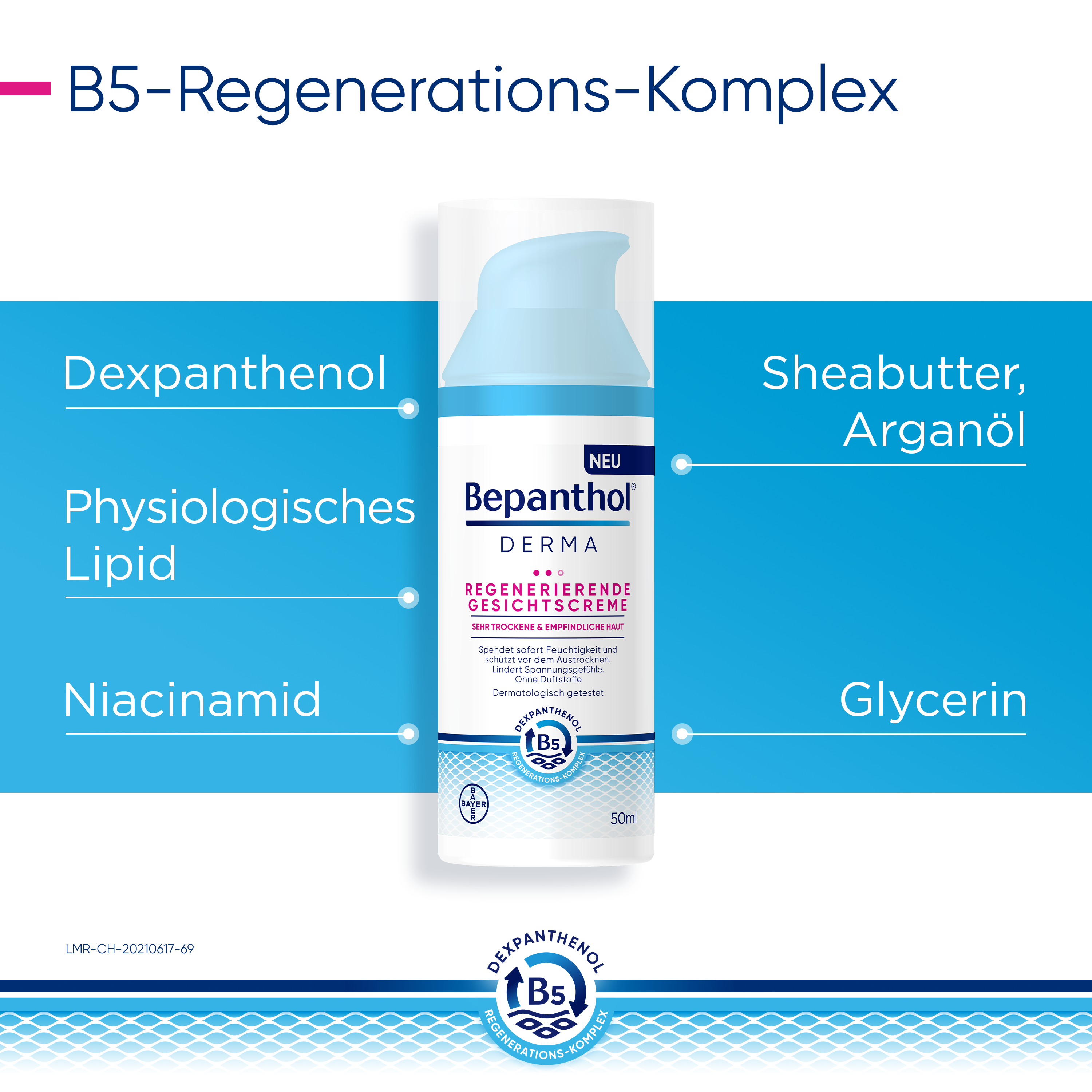 Der B5-Regenerations-Komplex unterstützt die Regeneration der Haut – von innen nach außen. Dabei fördert Dexpanthenol in tieferen Hautschichten der Epidermis die natürliche Zellregeneration. Das enthaltene Glycerin spendet sofortige und lang anhaltende Feuchtigkeit. Niacinamid (Vitamin B3) beruhigt juckende, trockene Haut und natürliche Lipide wie Sheabutter und Arganöl ergänzen fehlende Hautlipide. Das physiologische Lipid unterstützt zusätzlich die Anordnung der Doppellipidschicht.
