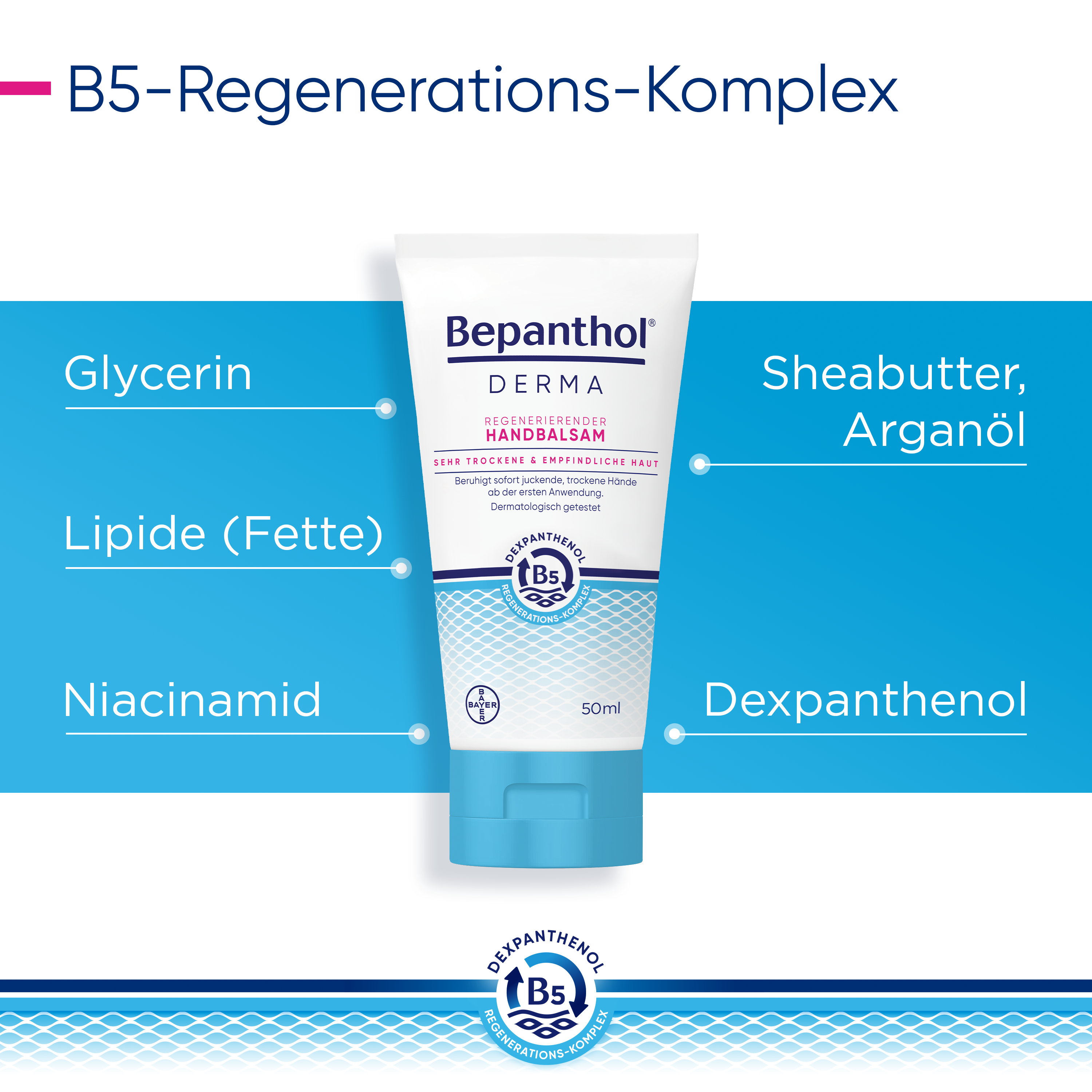 - Bepanthol® DERMA Regenerierender Handbalsam ist für die tägliche Pflege geeignet, spendet Feuchtigkeit und Schutz für raue und beanspruchte Haut. Er beruhigt trockene und juckende Hände sofort.