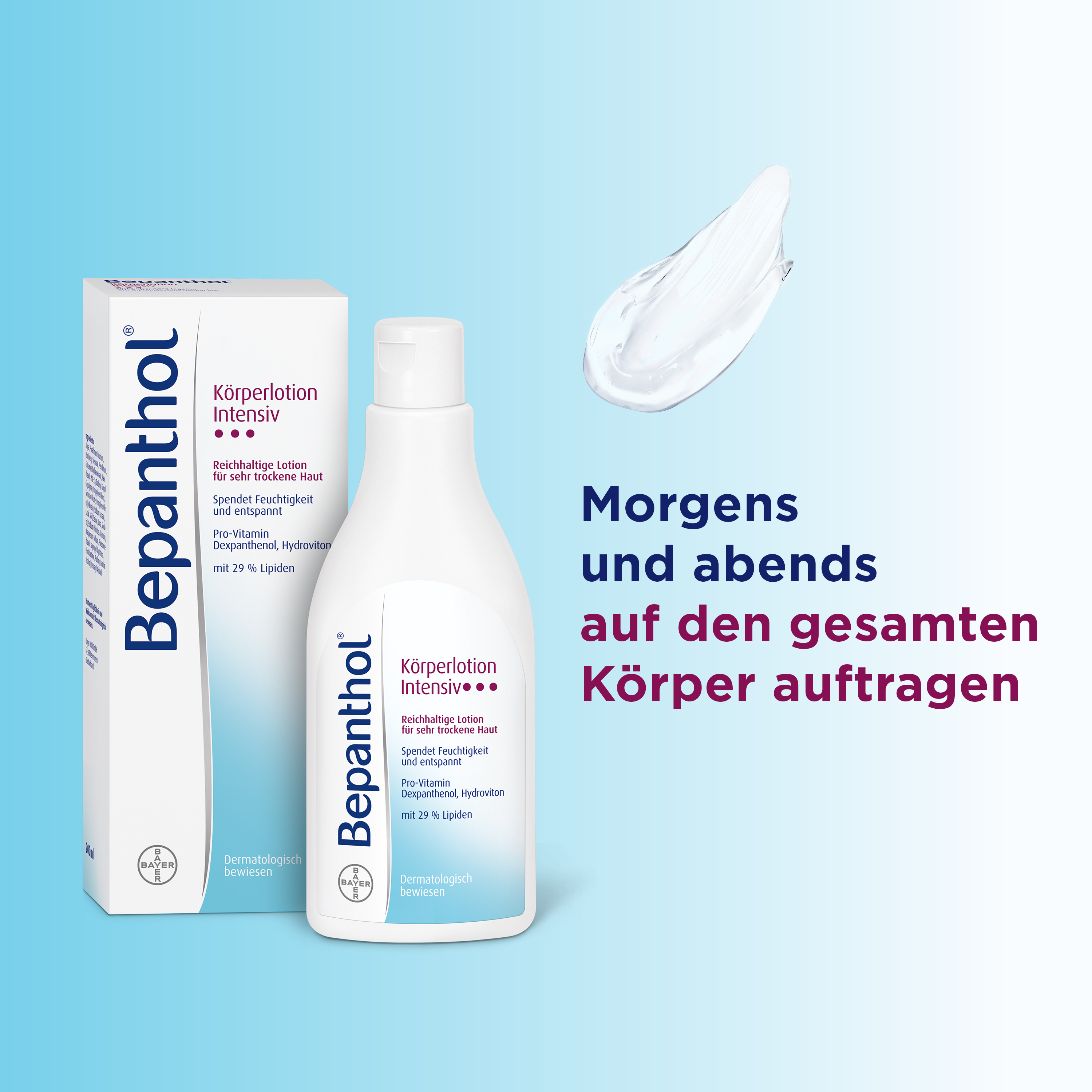 Die bewährte Bepanthol® Körperlotion Intensiv mit dem Pro-Vitamin Dexpanthenol ist eine Lotion mit reichhaltiger Konsistenz; so wird der Fetthaushalt der Haut stabilisiert und der Wiederaufbau der Hautschutzbarriere unterstützt. Der Feuchthaltekomplex Hydroviton®* mit Urea, Allantoin, Aminosäure und Lactat spendet der Haut Feuchtigkeit und sie fühlt sich glatt und geschmeidig an.