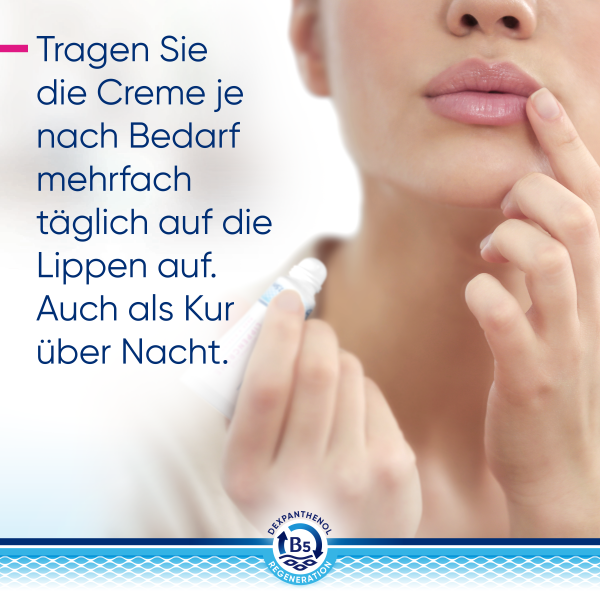 Die Bepanthol Reichhaltige Lippencreme pflegt strapazierte und rissige Lippenhaut intensiv und unterstützt sie bei der Regeneration. Die Inhaltsstoffe der Lippencreme versorgen die Lippen mit Feuchtigkeit, machen sie wieder geschmeidig und schützen sie vor weiterer Austrocknung. Anwenden können Sie die Bepanthol® Reichhaltige Lippencreme einfach bei Bedarf, oder aber als Kur über Nacht.