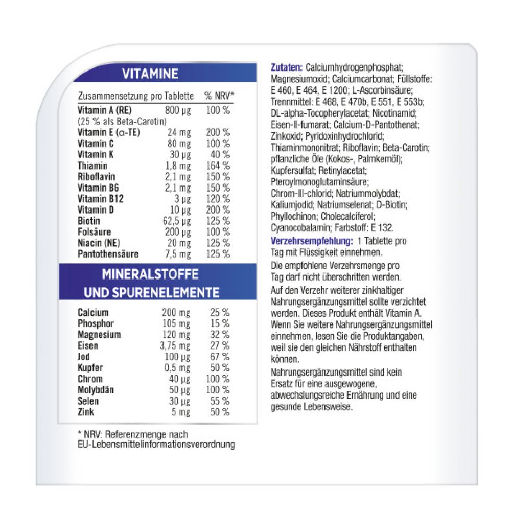 Zusammensetzung: Mikronährstoffe pro Tablette % NRV[*] Vitamin A (RE) (50% als Beta-Carotin) 800 µg 100 % Vitamin E (α-TE) 18 mg 150 % Vitamin C 120 mg 150 % Vitamin K 30 µg 40 % Thiamin 1,65 mg 150 % Riboflavin 2,1 mg 150 % Vitamin B6 2,1 mg 150 % Vitamin B12 3 µg 120 % Vitamin D 5 µg 100 % Biotin 75 µg 150 % Folsäure 300 µg 150 % Niacin (NE) 24 mg 150 % Pantothensäure 9 mg 150 % Calcium 162 mg 20 % Phosphor 125 mg 18 % Magnesium 100 mg 27 % Eisen 2,1 mg 15 % Jod 100 µg 67 % Kupfer 500 µg 50 % Mangan 2 mg 100 % Chrom 40 µg 100 % Molybdän 50 µg 100 % Selen 30 µg 55 % Zink 5 mg 50 % * NRV: Referenzmenge nach EU-Lebensmittelinformationsverordnung.