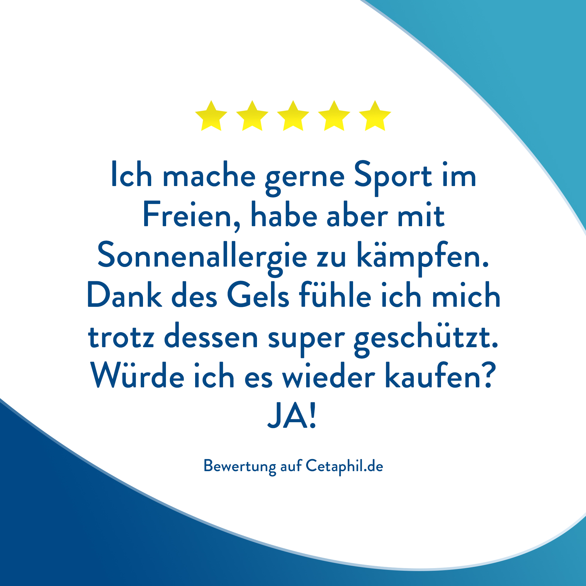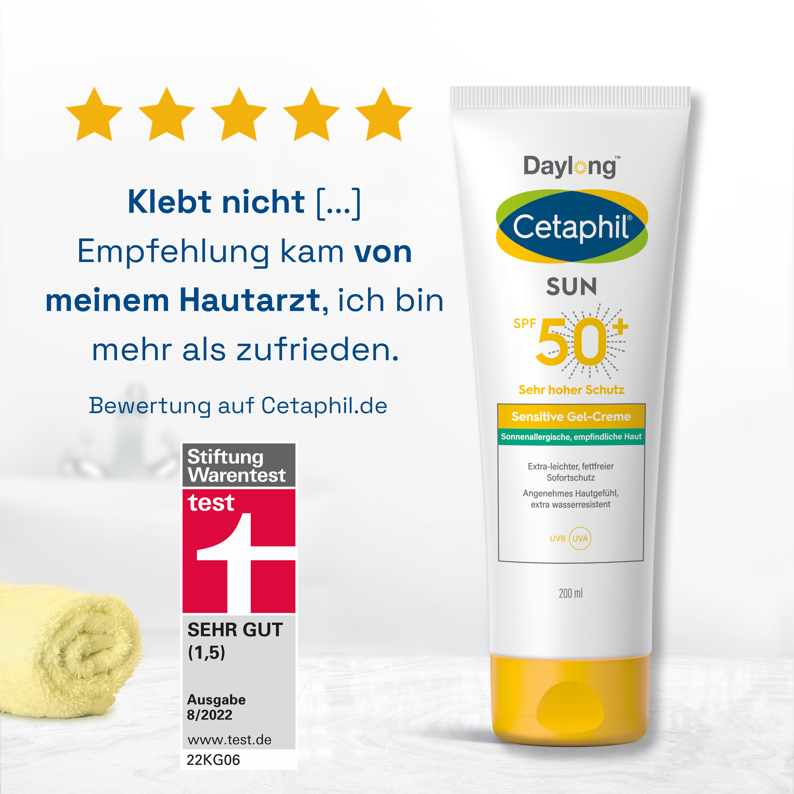 Das Cetaphil® Sun DaylongTM SPF 50+ Sensitive Gel-Creme ist dank der fett- und emulgatorfreien Formulierung speziell für fettige, allergische und besonders sonnenempfindliche Haut, sowie Anwender, die zu Sonnenallergie oder Mallorca Akne neigen, geeignet. Auf Konservierungsstoffe, Parfüm und Emulgatoren wird verzichtet. Die Hautverträglichkeit von Cetaphil® Sun DaylongTM wurde dermatologisch bestätigt. Wenn Sie gerne auf hochwirksamen, zuverlässigen und besonders verträglichen Sonnenschutz vertrauen, sind die Cetaphil® Sun DaylongTM SPF 50+ Sensitive Gel-Cremes die richtige Wahl.