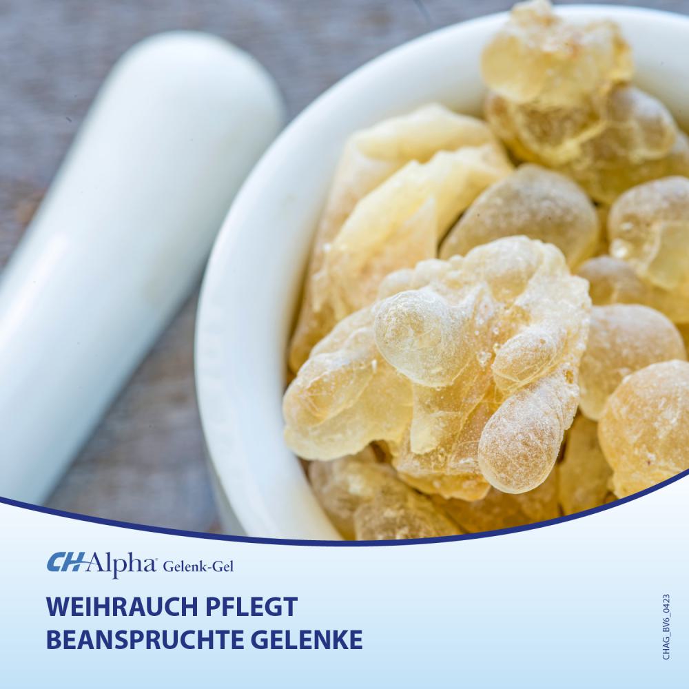 CH Alpha® Gelenk Gel wird auf die Haut aufgetragen und ist ein Intensiv-Pflege-Gel mit dem Dreifachkomplex aus Ingwer, Weihrauch und Arnika.
