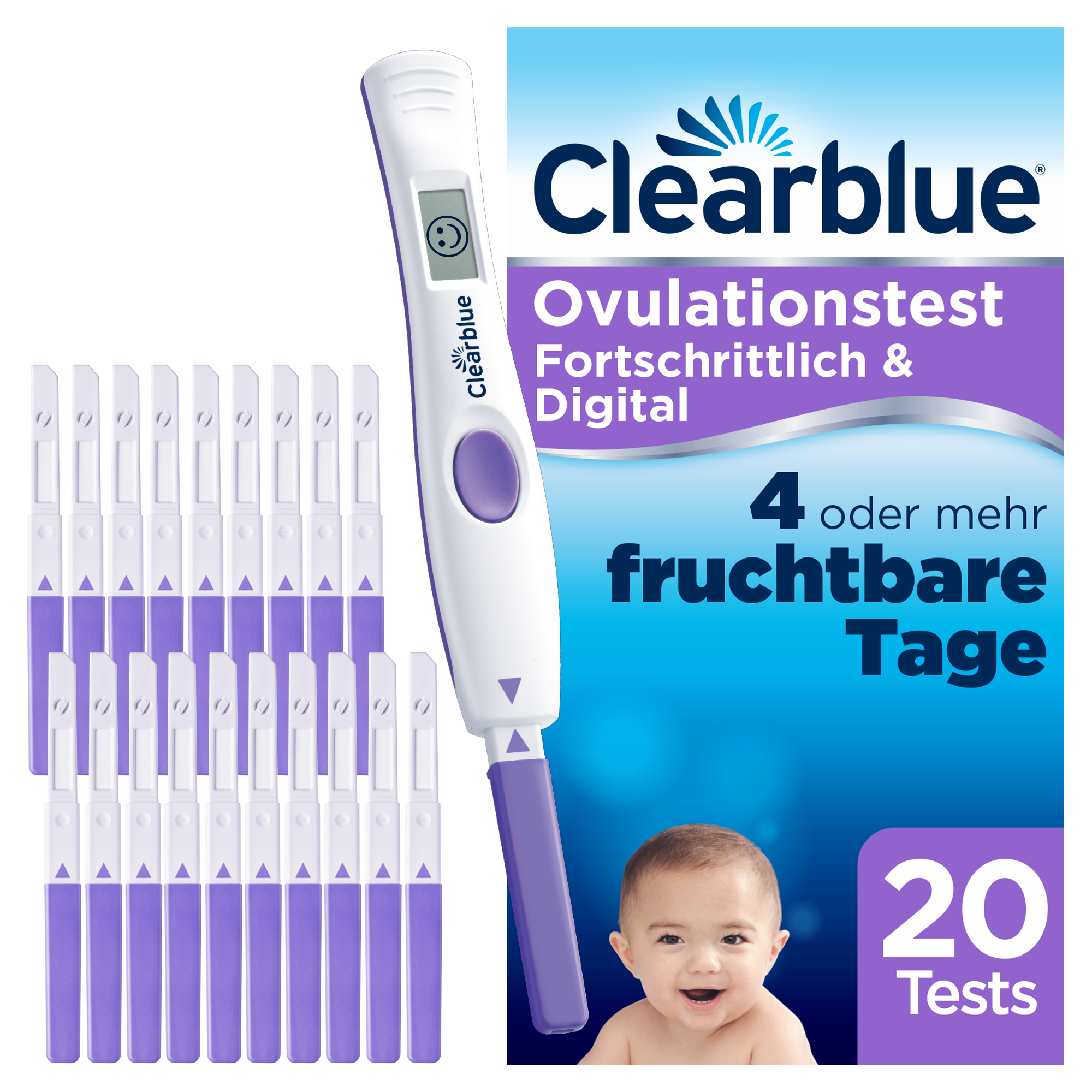 • Eindeutige Ergebnisse – An Ihren fruchtbaren Tagen erscheint der einzigartige lächelnde Clearblue Smiley: Wenn Sie an Tagen mit hoher oder maximaler Fruchtbarkeit Geschlechtsverkehr haben, erhöhen Sie Ihre Chancen, schwanger zu werden, auf ein Maximum