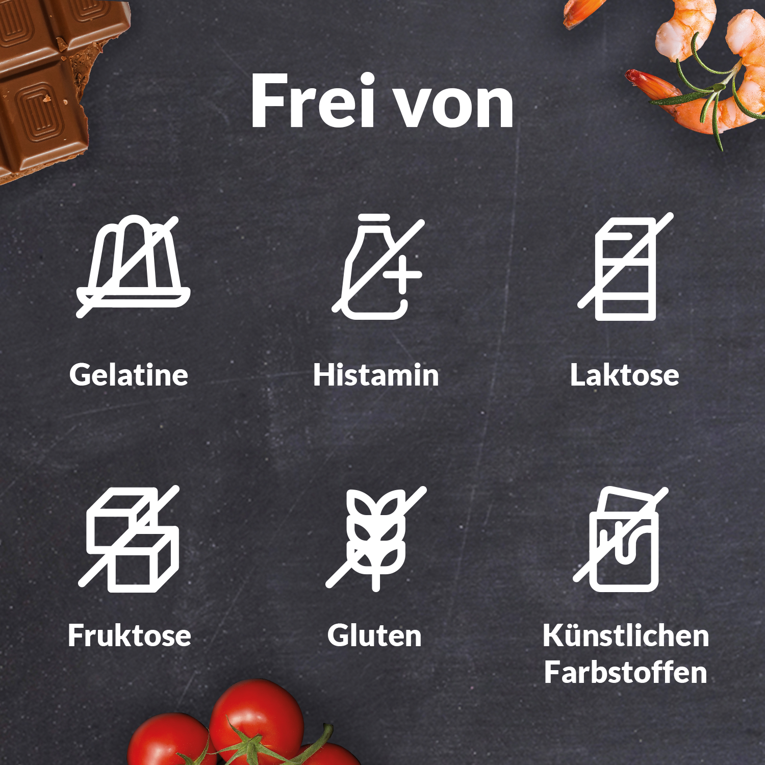 Frei von Gelatin, Histaminen, Laktose, Fruktose, Gluten und künstlichen Farbstoffen