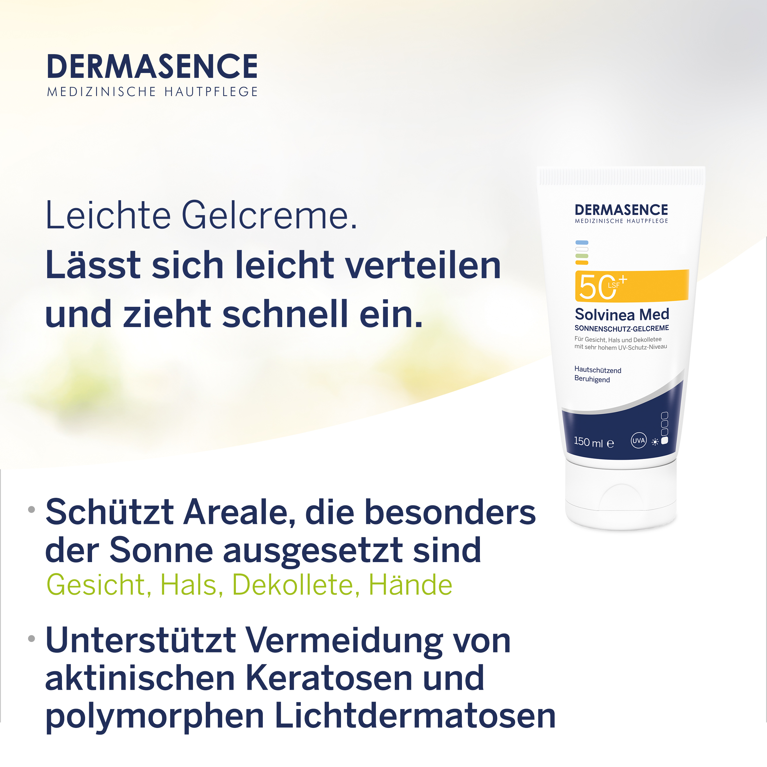 Die leichte Gelcreme mit sehr hohem UVA-/UVB-Schutz ist für die empfindliche sowie fettende und zu Unreinheiten neigende Haut geeignet. Sie schützt Areale, die der Sonne besonders intensiv ausgesetzt sind, wie Gesicht, Hals, Dekolleté und Hände vor UV-bedingter Hautalterung.