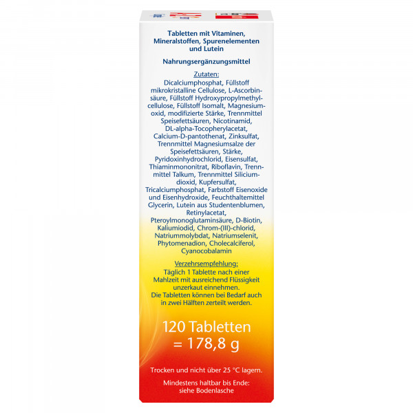 Dicalciumphosphat, Füllstoff mikrokristalline Cellulose, L-Ascorbinsäure, Füllstoff Hydroxypropylmethylcellulose, Füllstoff Isomalt, Magnesiumoxid, modifizierte Stärke, Trennmittel Speisefettsäuren, Nicotinamid, DL-alpha-Tocopherylacetat, Calcium-D-panthothenat, Zinksulfat, Trennmittel Magnesiumsalze der Speisefettsäuren, Stärke, Pyridoxinhydrochlorid, Eisensulfat, Thiaminmononitrat, Riboflavin, Trennmittel Talkum, Trennmittel Siliciumdioxid, Kupfersulfat, Tricalciumphosphat, Farbstoff Eisenoxide und Eisenhydroxide, Feuchthaltemittel Glycerin, Lutein aus Studentenblumen, Retinylacetat, Pteroylmonoglutaminsäure, D-Biotin, Kaliumiodid, Chrom-(III)-Chlorid, Natriummolybdat, Natriumselenit, Phytomenadion, Cholecalciferol, Cyanocobalamin