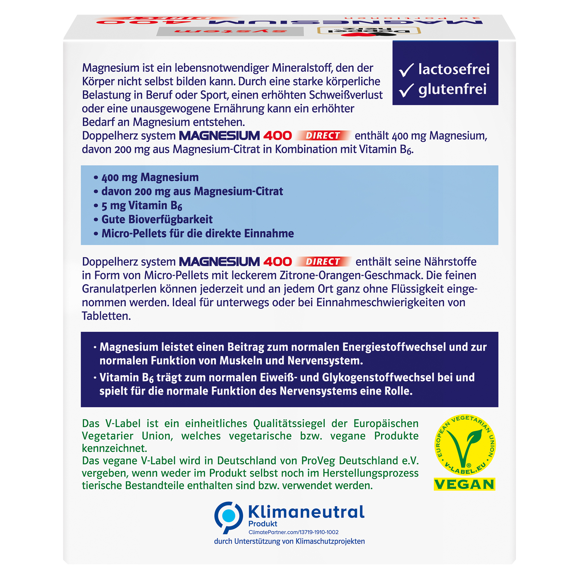 • 400 mg Magnesium, davon 200 mg aus Magnesium-Citrat, pro Portionsbeutel kombiniert mit 5 mg Vitamin B6