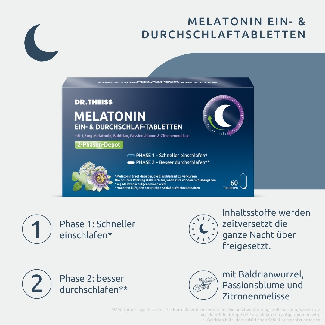 Vertrauen Sie bei Schlafproblemen auf DR. THEISS – Die meistverkauften Melatonin-Produkte in der deutschen Apotheke*. DR. THEISS Melatonin Ein- & Durchschlaf-Tabletten sind ein Nahrungsergänzungsmittel mit Melatonin und Extrakten aus Baldrianwurzel, Passionsblume und Zitronenmelisse. Melatonin ist ein natürlich vorkommendes Hormon, das von der Zirbeldrüse in unserem Gehirn produziert wird. Es spielt eine wichtige Rolle bei der Regulation unseres Schlaf-Wach-Zyklus. Melatonin wird oft als Einschlafhilfe verwendet, um Menschen dabei zu helfen, besser einzuschlafen und durchzuschlafen. Stressige Lebensphasen, Schicht- und Nachtarbeit oder lange Flugreisen über mehrere Zeitzonen hinweg, können zu Schlafproblemen führen. Für viele Menschen, die unter Schlafstörungen leiden, kann Melatonin eine effektive Lösung sein. Schlafstörungen können verschiedene Formen annehmen, wie zum Beispiel Schwierigkeiten beim Einschlafen, häufiges Aufwachen während der Nacht oder das Gefühl von nicht erholsamem Schlaf. In solchen Fällen kann die Einnahme von Melatonin z. B. in Form von Ein- & Durchschlaf-Tabletten helfen, den Schlaf-Wach-Rhythmus zu regulieren und die Schlafqualität zu verbessern. Erholsamer Schlaf ist wichtig, um die körperliche und geistige Gesundheit sowie Leistungsfähigkeit zu erhalten. Während des Schlafs erholt sich unser Körper von den Aktivitäten des Tages und bereitet sich auf den nächsten Tag vor. Stressige Lebensphasen, Schicht- und Nachtarbeit können zu Einschlafproblemen führen. DR. THEISS Melatonin Ein- & Durchschlaf-Tabletten mit einem innovativen 2-Phasen-Freisetzungsprozess: 1. Phase (schneller einschlafen): 1 mg Melatonin* trägt dazu bei die Einschlafzeit zu verkürzen. Passionsblume und Zitronenmelisse können den Schlaf unterstützen und für Entspannung sorgen. 2. Phase (besser durchschlafen**): 0,5 mg Melatonin und Baldrianwurzel-Extrakt** werden zeitversetzt abgegeben. Baldrian unterstützt das Durchschlafen. • Nahrungsergänzungsmittel bei Schlafproblemen • Schneller einschlafen, besser durchschlafen • Schlaftabletten (Nahrungsergänzungsmittel) mit 2-Phasen-Freisetzungsprozess • Unterstützung des natürlichen Schlafzyklus • Mit Melatonin, Passionsblumen- und Baldrianextrakt und Zitronenmelisse. • Laktosefrei, zuckerarm und alkoholfrei • Vegan *Melatonin trägt dazu bei, die Einschlafzeit zu verkürzen. Die positive Wirkung stellt sich ein, wenn kurz vor dem Schlafengehen 1 mg Melatonin aufgenommen wird. **Baldrian hilft, den natürlichen Schlaf aufrechtzuerhalten.