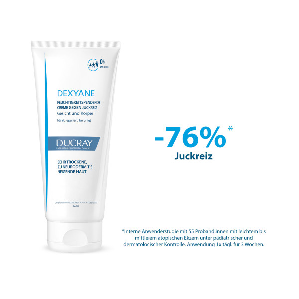 Eine sehr trockene, zu Neurodermitis neigende Haut fühlt sich oft sehr unangenehm an. Grund dafür ist eine beschädigte Hautbarriere, was zu vermehrtem Spannungsgefühl und teilweise starkem Juckreiz führen kann. DEXYANE Anti-Juckreiz Creme pflegt, repariert und beruhigt sehr trockene, zu Neurodermitis neigende Haut, indem er ihr mehr Komfort bietet.