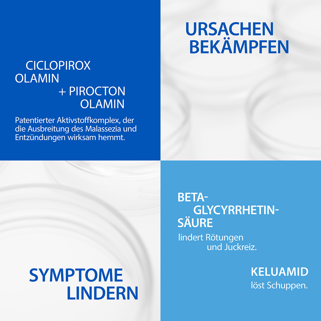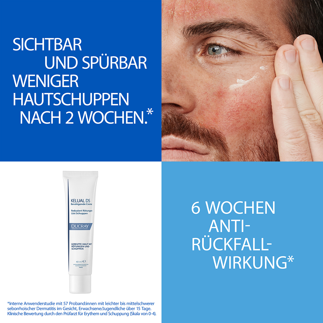 Die Kelual DS Anti-Schuppen Creme entfernt dank der patentierten Aktivstoff-Kombination aus Ciclopirox Olamin + Pirocton Olamin effektiv Schuppen im Gesicht und beugt Rückfällen 6 Wochen* lang vor.