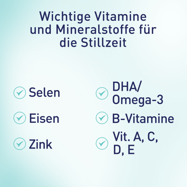 Elevit® 3 wurde speziell auf die Bedürfnisse von Mutter und Kind während der Stillzeit abgestimmt und enthält unter anderem folgende Inhaltsstoffe: