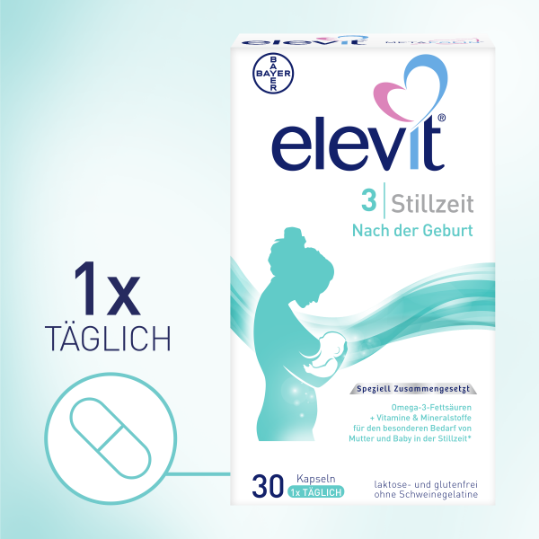Während der anspruchsvollen Stillzeit unterstützt Elevit® 3 die Deckung des erhöhten Nährstoffbedarfs. Das Präparat ist dabei ganz einfach einzunehmen: Eine Kapsel täglich ist bereits ausreichend, um mit vielen wichtigen Nährstoffen versorgt zu werden. Elevit® 3 ist außerdem frei von Laktose, Gluten und Schweinegelatine.