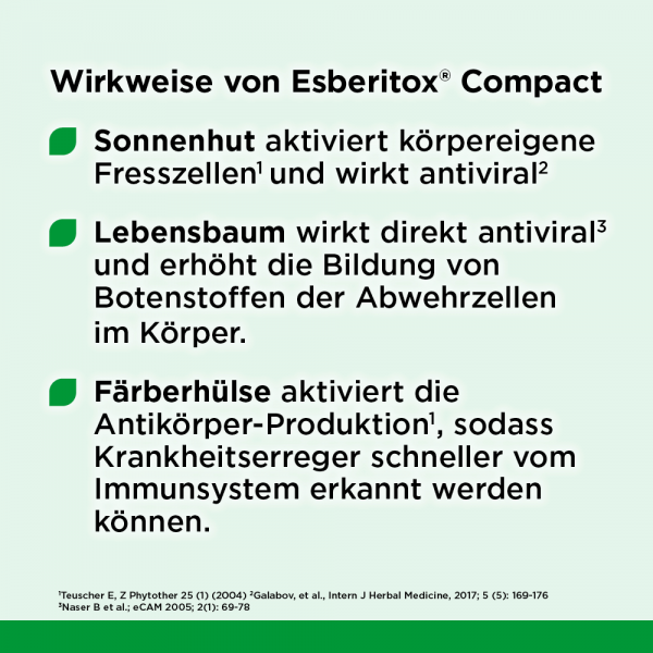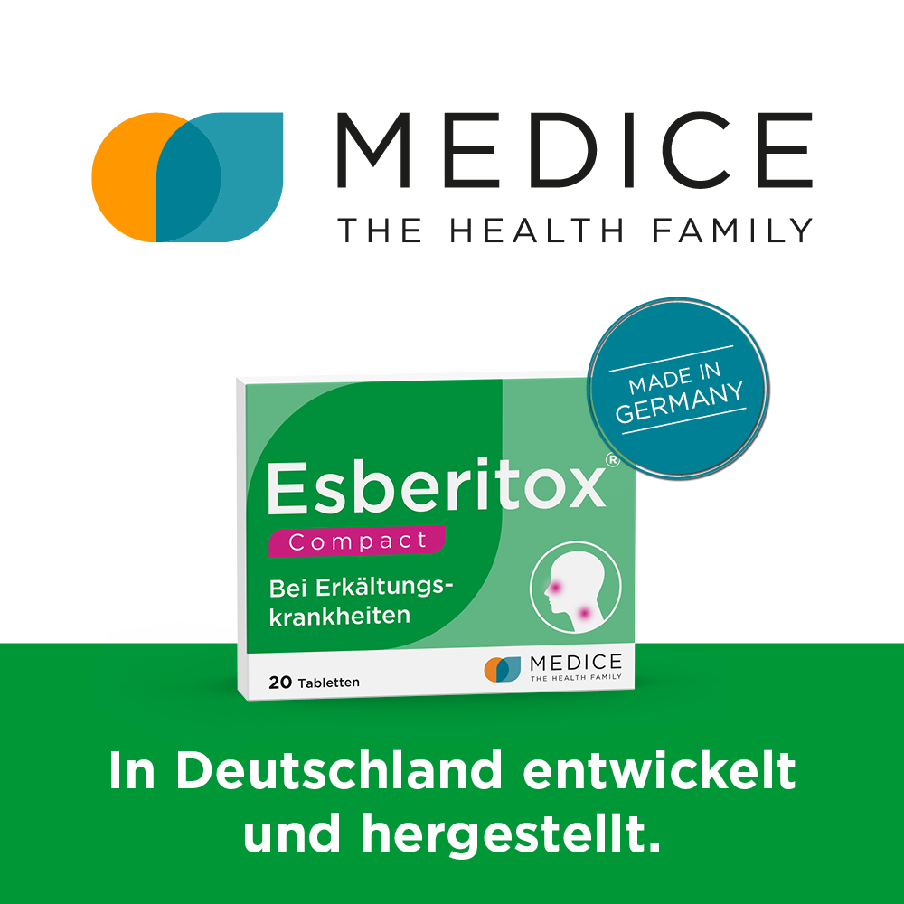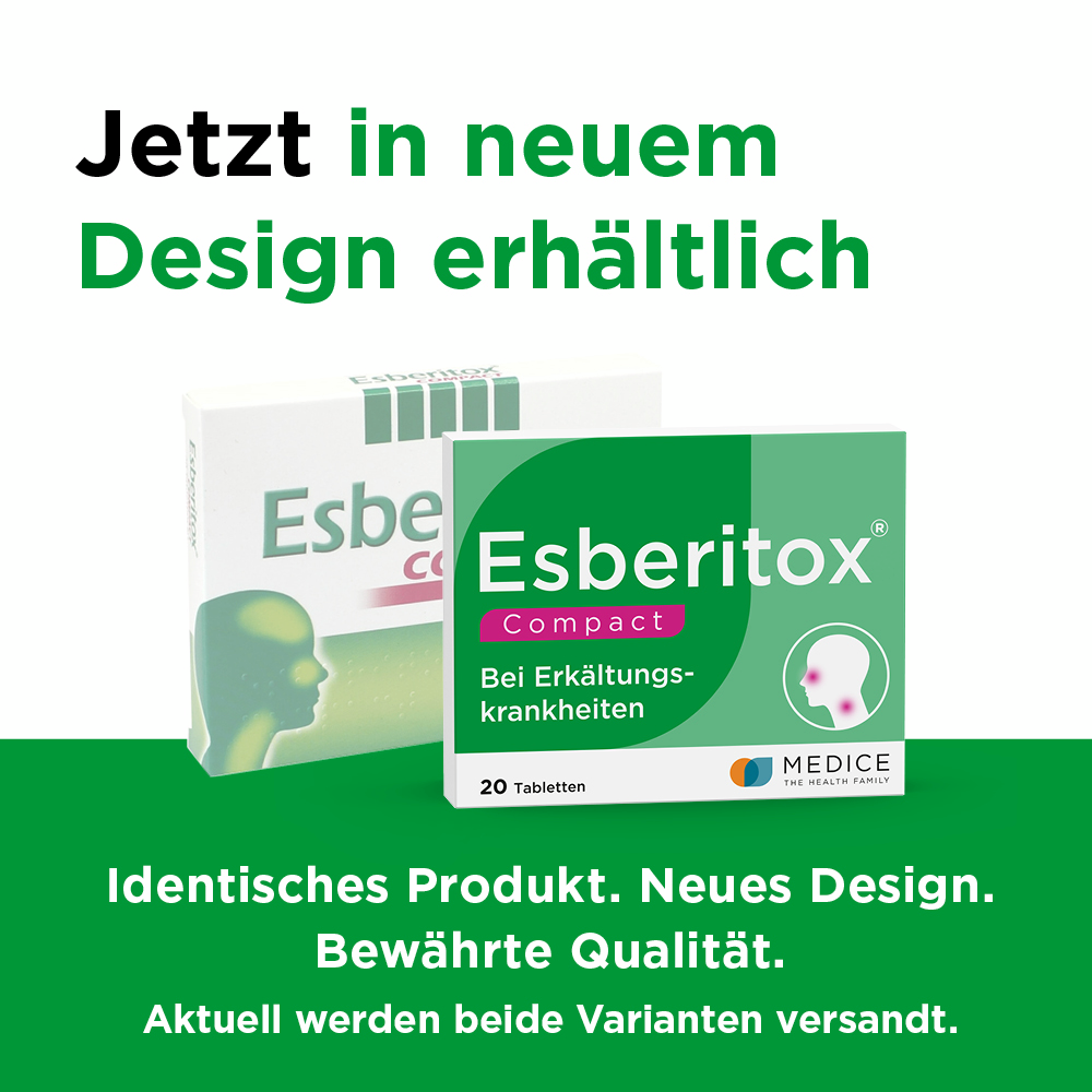 Esberitox®COMPACTist ein pflanzliches Arzneimittel bei Erkältungskrankheiten.Die moderne Forschung macht’s möglich: Esberitox COMPACT enthält den sogenannten Immun-Aktivkomplex von Esberitox in besonders hochkonzentrierter Form.In dem pflanzlichen Präparat der neuesten Generation mit wissenschaftlich belegter Wirksamkeit2 werden in einer genau festgelegten Rezeptur die Pflanzen-Wirkstoffe Lebensbaum, Färberhülse und Sonnenhut gemischt, schonend extrahiert und 5-fach konzentriert.Das Resultat: eine pflanzlich hochwirksame Kombination, die die antiviralen und immunstimulierenden Eigenschaften der drei Inhaltsstoffe vereint.Wissenschaftlich belegte WirksamkeitKlinische Studien mit Hunderten von Patienten haben die Wirksamkeit von Esberitox bestätigt: Die Erkältungsdauer wird um 2–3 Tage verkürzt Die Erkältungssymptome werden effektiv gelindert 2,3 Bitte befolgen Sie unsere Einnahmetipps, damit Esberitox COMPACT richtig wirken kann. Weitere Hinweise erhalten Sie auch in der Packungsbeilage von Esberitox COMPACT.1 16 mg Trockenextrakt aus pflanzlichen Wirkstoffen pro Tablette, i. Vgl. zu 3,2 mg Pflanzenextrakt in Esberitox Tabletten.2 Studie mit wirkstoffgleichem Produkt durchgeführt; Quelle: Henneicke-von Zepelin, H.-H., et al., Current Medical Research and Opinion, Vol. 15 (1999): 214-227.3 Naser B. et al., Phytomedicine 12(10) (2005): 715-722.Abklingen der Symptome des viralen AtemwegsinfektsWann, wie oft, wie viel:So nehmen Sie Esberitox COMPACT einBereits bei den ersten Anzeichen eingenommen – Hals- bzw. Rachenschmerzen, Niesen, laufender Nase, schmerzende Bronchien – hat Esberitox COMPACT den besten Effekt.Wichtig: Nehmen Sie Esberitox COMPACT immer auch zusätzlich zu symptomlindernden Schnupfensprays, Grippe-, Schmerz- und Hustenmitteln*. So kann die Erkältung schnell und gut auskuriert werden.*TIPP: Bei Husten empfehlen wir Ihnen die Kombination mit Esberi-Efeu Hustensaft!Dosierung:Erwachsene und Jugendliche ab 12 Jahren nehmen 3-mal täglich eine Tablette Esberitox COMPACT ein. Die Tabletten sollten morgens, mittags und abends mit ausreichend Flüssigkeit, vorzugsweise Wasser, eingenommen werden. Die Tabletten können auch gekaut werden. Für Menschen, die Probleme beim Schlucken von Tabletten haben, ist das eine große Erleichterung. Für das Kauen spricht auf jeden Fall der leckere und frische Zitronengeschmack. Weiteres Plus: Die Tabletten sind zucker- und lactosefrei.Produkt ProfilEsberitox COMPACT – das pflanzliche Präparat der neuesten Generation mit 5-fach konzentrierten1 Pflanzen-Wirkstoffen Wirkt ursächlich und bekämpft die Erkältungsviren direkt Mit dem Immun-Aktivkomplex aus Lebensbaum, Färberhülse und Sonnenhut Verkürzt die Erkältungsdauer um 2–3 Tage2 Lindert alle Symptome Zum Kauen und zur Einnahme mit Wasser geeignet Gluten-, Zucker- und Lactosefrei
