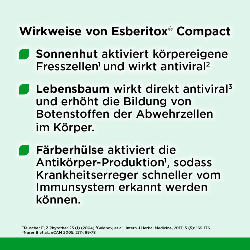 Esberitox®COMPACTist ein pflanzliches Arzneimittel bei Erkältungskrankheiten.Die moderne Forschung macht’s möglich: Esberitox COMPACT enthält den sogenannten Immun-Aktivkomplex von Esberitox in besonders hochkonzentrierter Form.In dem pflanzlichen Präparat der neuesten Generation mit wissenschaftlich belegter Wirksamkeit2 werden in einer genau festgelegten Rezeptur die Pflanzen-Wirkstoffe Lebensbaum, Färberhülse und Sonnenhut gemischt, schonend extrahiert und 5-fach konzentriert.Das Resultat: eine pflanzlich hochwirksame Kombination, die die antiviralen und immunstimulierenden Eigenschaften der drei Inhaltsstoffe vereint.Wissenschaftlich belegte WirksamkeitKlinische Studien mit Hunderten von Patienten haben die Wirksamkeit von Esberitox bestätigt: Die Erkältungsdauer wird um 2–3 Tage verkürzt Die Erkältungssymptome werden effektiv gelindert 2,3 Bitte befolgen Sie unsere Einnahmetipps, damit Esberitox COMPACT richtig wirken kann. Weitere Hinweise erhalten Sie auch in der Packungsbeilage von Esberitox COMPACT.1 16 mg Trockenextrakt aus pflanzlichen Wirkstoffen pro Tablette, i. Vgl. zu 3,2 mg Pflanzenextrakt in Esberitox Tabletten.2 Studie mit wirkstoffgleichem Produkt durchgeführt; Quelle: Henneicke-von Zepelin, H.-H., et al., Current Medical Research and Opinion, Vol. 15 (1999): 214-227.3 Naser B. et al., Phytomedicine 12(10) (2005): 715-722.Abklingen der Symptome des viralen AtemwegsinfektsWann, wie oft, wie viel:So nehmen Sie Esberitox COMPACT einBereits bei den ersten Anzeichen eingenommen – Hals- bzw. Rachenschmerzen, Niesen, laufender Nase, schmerzende Bronchien – hat Esberitox COMPACT den besten Effekt.Wichtig: Nehmen Sie Esberitox COMPACT immer auch zusätzlich zu symptomlindernden Schnupfensprays, Grippe-, Schmerz- und Hustenmitteln*. So kann die Erkältung schnell und gut auskuriert werden.*TIPP: Bei Husten empfehlen wir Ihnen die Kombination mit Esberi-Efeu Hustensaft!Dosierung:Erwachsene und Jugendliche ab 12 Jahren nehmen 3-mal täglich eine Tablette Esberitox COMPACT ein. Die Tabletten sollten morgens, mittags und abends mit ausreichend Flüssigkeit, vorzugsweise Wasser, eingenommen werden. Die Tabletten können auch gekaut werden. Für Menschen, die Probleme beim Schlucken von Tabletten haben, ist das eine große Erleichterung. Für das Kauen spricht auf jeden Fall der leckere und frische Zitronengeschmack. Weiteres Plus: Die Tabletten sind zucker- und lactosefrei.Produkt ProfilEsberitox COMPACT – das pflanzliche Präparat der neuesten Generation mit 5-fach konzentrierten1 Pflanzen-Wirkstoffen Wirkt ursächlich und bekämpft die Erkältungsviren direkt Mit dem Immun-Aktivkomplex aus Lebensbaum, Färberhülse und Sonnenhut Verkürzt die Erkältungsdauer um 2–3 Tage2 Lindert alle Symptome Zum Kauen und zur Einnahme mit Wasser geeignet Gluten-, Zucker- und Lactosefrei
