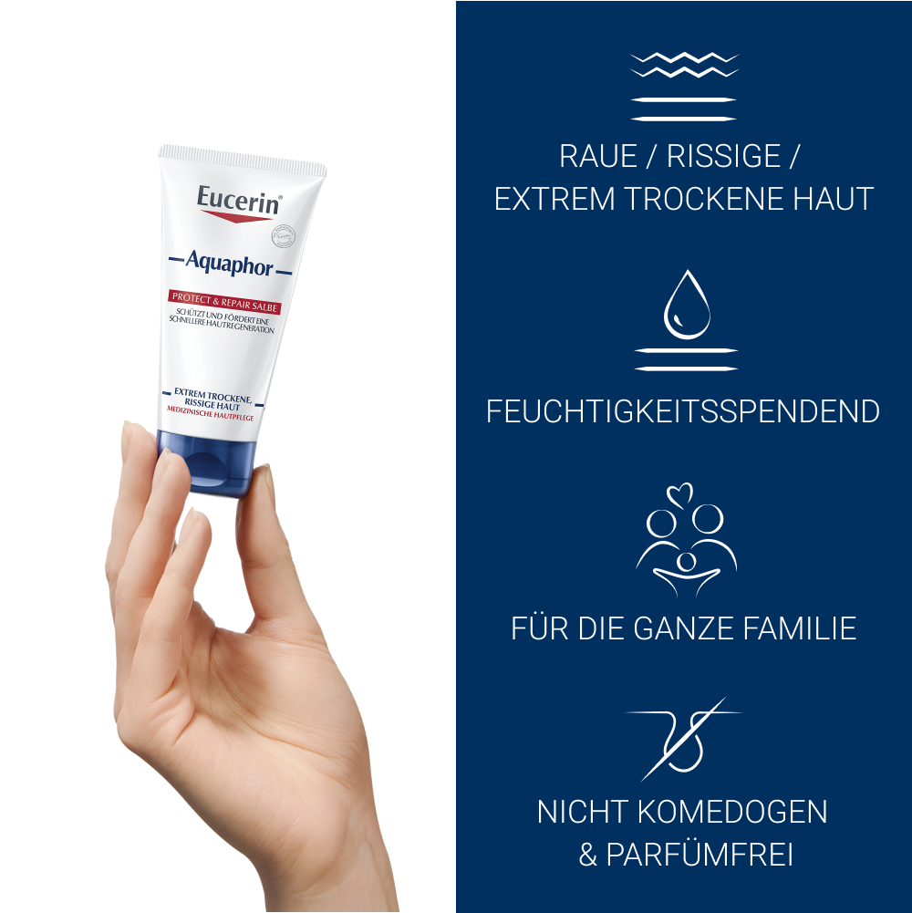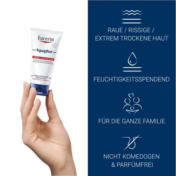 Die Eucerin Aquaphor Repair Salbe wurde speziell für die Pflege von extrem trockener, rissiger und irritierter Haut entwickelt und unterstützt eine schnellere Hautregeneration.