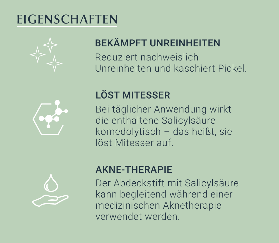 Auch begleitend während einer medizinischen Aknetherapie und auch während einer Schwangerschaft kann der Abdeckstift mit Salicylsäure verwendet werden.