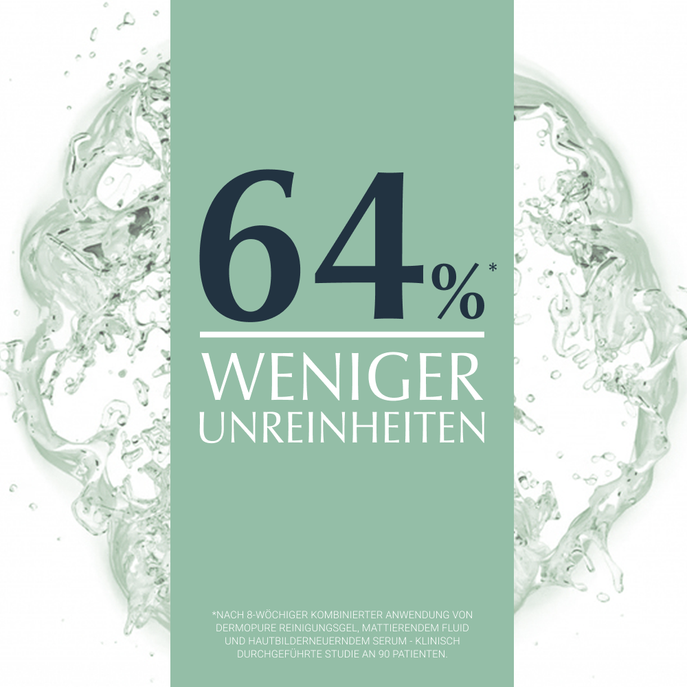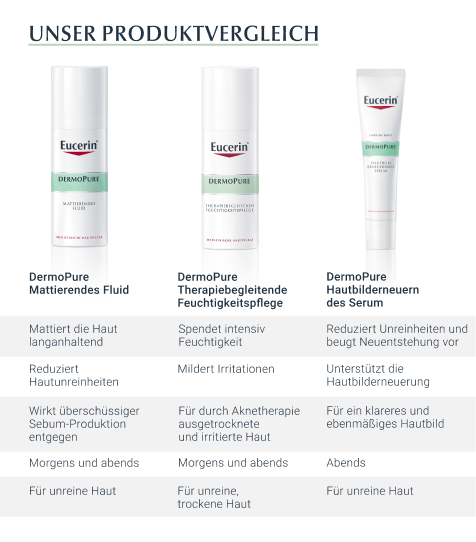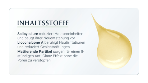 Das Eucerin DermoPure Mattierende Fluid hilft effektiv bei anspruchsvoller, unreiner, zu Akne neigender Haut und Pickeln. Außerdem können die Unreinheiten langfristig kontrolliert werden. Die Gesichtspflege kombiniert mehrere Inhaltsstoffe für ein reineres und mattiertes Hautbild: Salicylsäre reduziert Hautunreinheiten und beugt ihrer Neuentstehung vor, Licochalcone A beruhigt bei Hautirritationen und reduziert Gesichtsrötungen, die sebumregulierende Technologie hilft die überschüssige Talg-Produktion zu hemmen und mattierende Partikel sorgen für einen 8-stündigen Anti-Glanz Effekt, ohne die Poren zu verstopfen.