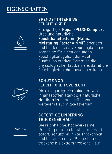 Der Repair-PLUS-Komplex der parfümfreien Bodylotion verbessert die Feuchtigkeitsbindung der Haut und bringt den Lipid-(Fett-) und Feuchtigkeitshaushalt wieder in ein natürliches Gleichgewicht. Dies wird durch die Kombination der Wirkstoffe Urea, Ceramide sowie die natürlichen Feuchthaltefaktoren erreicht. Spannungsgefühl, Juckreiz oder Schuppung werden sofort gelindert. Die Feuchtigkeitscreme ist therapiebegleitend auch zur Pflege z. B. bei diabetischer Haut, Psoriasis und Keratosis pilaris geeignet.