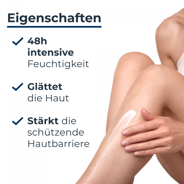 Der Repair-PLUS-Komplex in der Körpercreme verbessert die Feuchtigkeitsbindung der Haut und so wird der Feuchtigkeitsgehalt in den oberen Hautschichten deutlich erhöht. Dies wird durch die Kombination des Wirkstoffs Urea mit natürlichen Feuchthaltefaktoren erreicht. Zugleich stärken Ceramide die hauteigene Barriere, schützen und pflegen intensiv. Spannungsgefühl, Juckreiz oder eine raue Oberfläche werden sofort gelindert. Dafür bleibt ein glattes und geschmeidiges Hautgefühl.