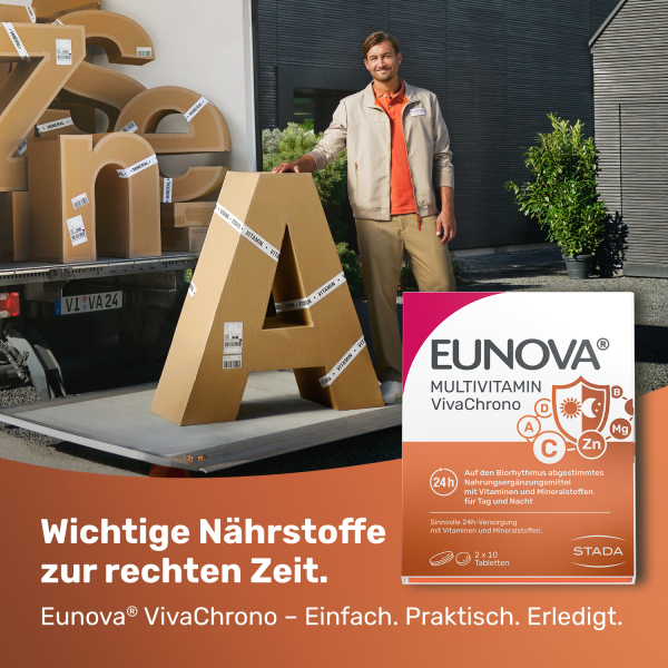 Um im anspruchsvollen Alltag fit zu sein, ist eine ausreichende Nährstoffversorgung wichtig. Nahrungsergänzungsmittel können, als Ergänzung zur täglichen Ernährung, den Körper in seiner Funktion und Leistungsfähigkeit unterstützen. Doch nicht alle Vitamine und Mineralstoffe werden zur gleichen Zeit benötigt, da sich viele körperliche Prozesse an einem 24h-Rhythmus orientieren, wie z.B. der Schlaf-Wach-Rhythmus. Die Muskelaktivität ist z.B. tagsüber höher, wohingegen bestimmte Körperprozesse nachts aktiver sind. Eine sinnvolle Nährstoffversorgung findet im Einklang mit der „inneren Uhr“ statt. EUNOVA® VivaChrono ist auf den 24h-Takt des Körpers abgestimmt – und unterstützt so mit einer speziellen Nährstoffkombination am Tag den Energiestoffwechsel und die Widerstandskraft des Körpers, in der Nacht trägt es zur Erholung und Regeneration bei.1,2,3,4,5 Durch die Kombination aus einer Tablette morgens und einer für den Abend mit durchdachten Tablettentechnologien werden die Nährstoffe bequem und clever koordiniert freigesetzt.
