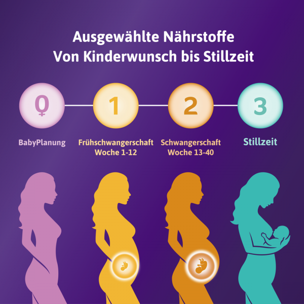 Femibion® 3 Stillzeit versorgt mit speziell ausgewählten Nährstoffen, als Ergänzung zu einer abwechslungsreichen Ernährung. Dazu gehören u.a. Folat (Folsäure & Metafolin®), die Omega-3-Fettsäure DHA, Cholin und Vitamin A, das zur Erhaltung normaler Sehkraft und zur normalen Funktion des Immunsystems beiträgt. Auch Calcium, das die normale Muskel- und Knochenfunktion unterstützt und das Carotinoid Lutein sind in Femibion® 3 Stillzeit enthalten.