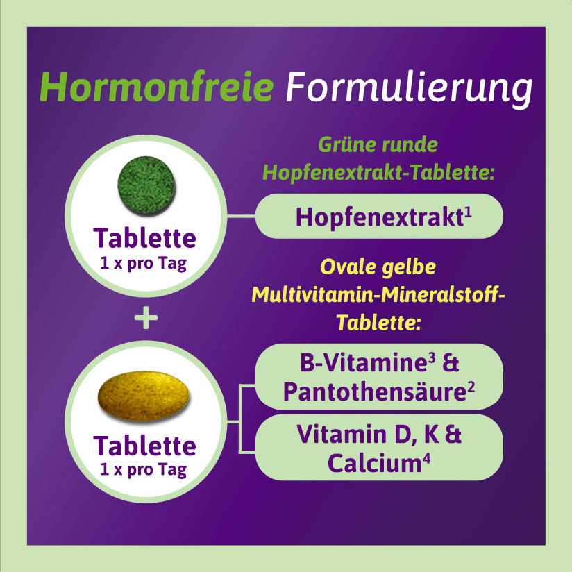 Eine Packung Femibion® Menopause Plus enthält Hopfenextrakt-Tabletten1, entwickelt, um Frauen bei der Bewältgung von Hitzewallungen zu helfen1. Zusätzlich enthält eine Packung Femibion® Menopause Plus Multvitamin- Mineralstoff-Tabletten.