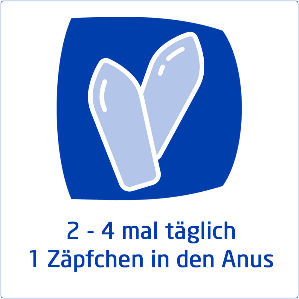 Soweit nicht anders verordnet, 2- bis 4-mal täglich 1 Zäpfchen in den Anus (Enddarm) einführen. Sollte bei Kindern bis zu einem Jahr wegen nicht ausreichend dokumentierter Erfahrung nicht angewendet werden.