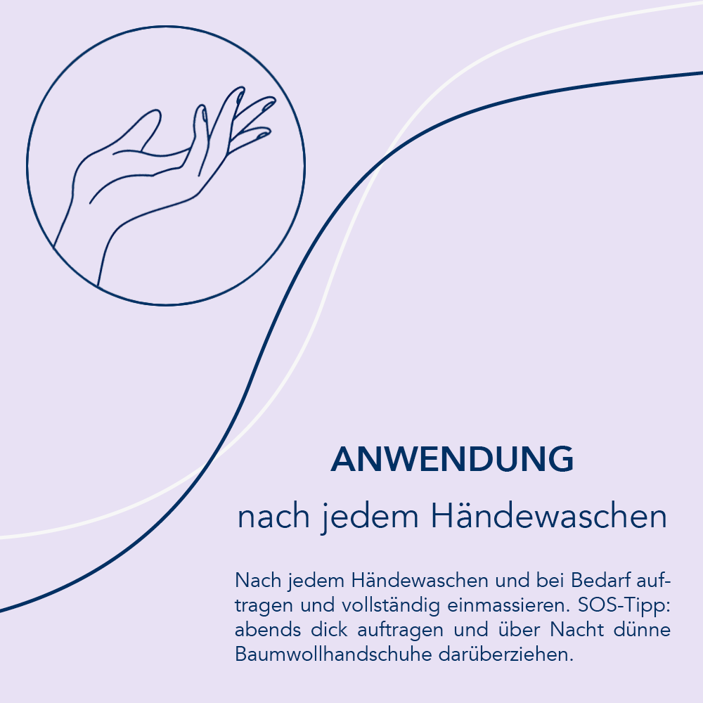 Nach jedem Händewaschen und bei Bedarf auftragen und vollständig einmassieren.