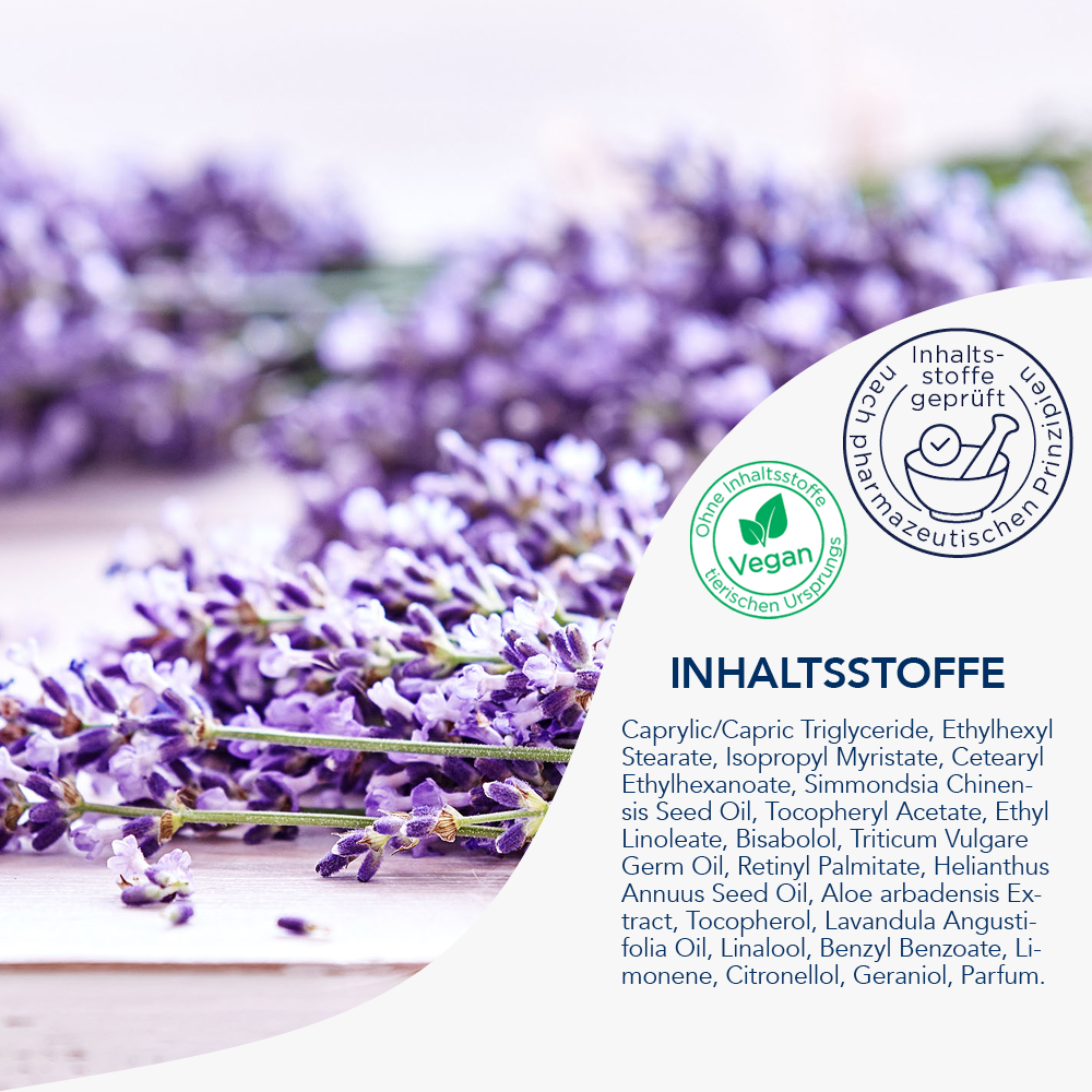 [A/24] Ingredients: Decyl Oleate, Cetearyl Ethylhexanoate, Ethylhexyl Stearate, Isopropyl Myristate, Helianthus Annuus (Sunflower) Seed Oil, Simmondsia Chinensis (Jojoba) Seed Oil, Tocopheryl Acetate, Ethyl Linoleate, Bisabolol, Caprylic/CapricTriglyceride, Parfum (Fragrance), Triticum Vulgare (Wheat) Germ Oil, Lavandula Oil/ Extract, Retinyl Palmitate, Linalyl Acetate, Linalool, Terpineol, Tocopherol, Aloe Barbadensis Extract, Crithmum Maritimum Extract, Benzyl Benzoate, Beta-Caryophyllene, Hydrogenated Palm Glycerides Citrate, Geraniol, Limonene, Pinene, Camphor, Citronellol, Geranyl Acetate.
