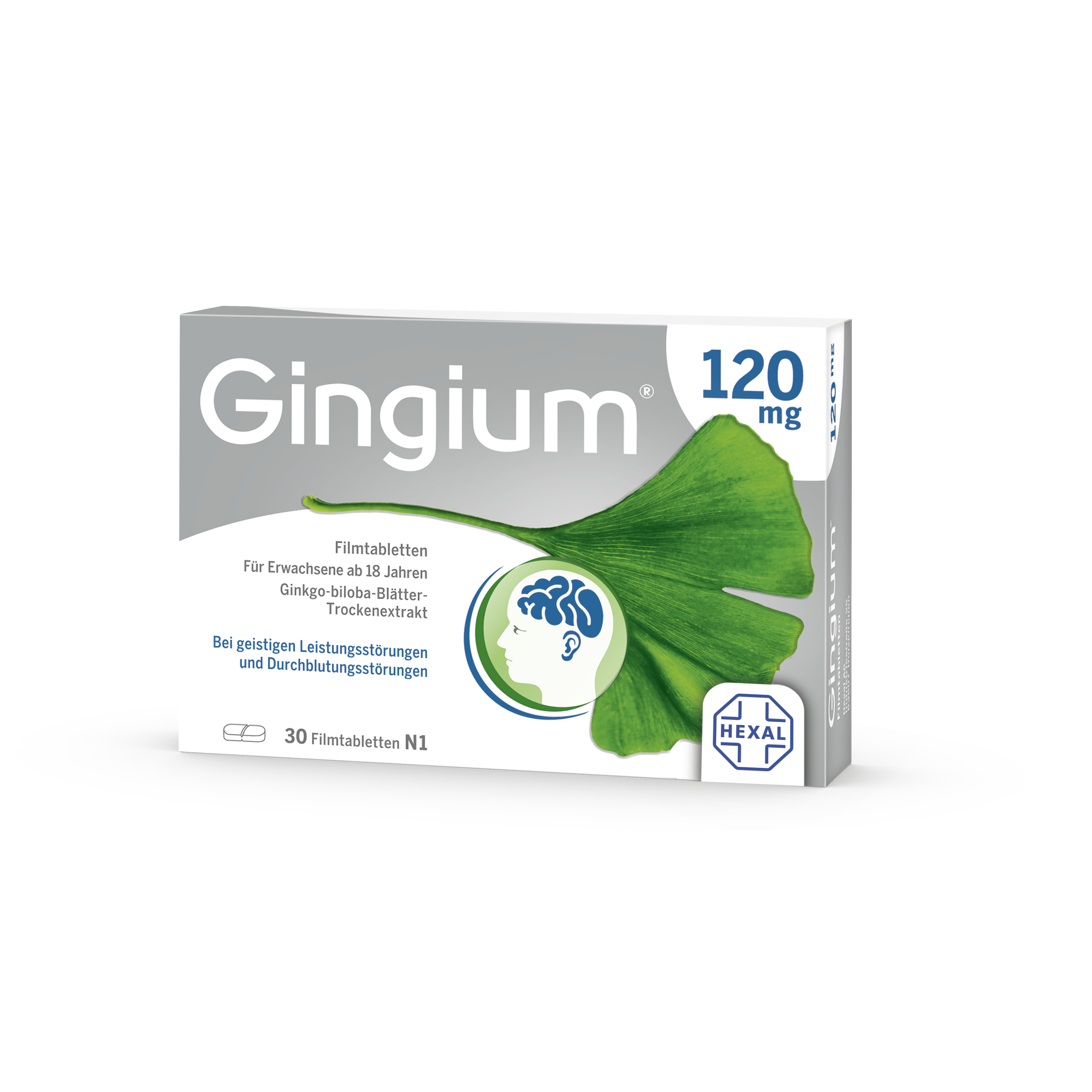 Damit das Gehirn seinen vielfältigen Aufgaben gut nachkommen kann, braucht es ausreichend Nährstoffe und Sauerstoff. Gingium® 120 mg hilft dabei, indem es die Durchblutung im Gehirn fördert und dadurch Gedächtnis und Konzentration verbessert.* Zudem unterstützt Gingium® 120 mg durch die bessere Durchblutung auch die Regeneration des Innenohrs bei Tinnitus**. Der hochwertige Spezialextrakt wird aus den Blättern des Ginkgo-Baumes gewonnen, weist eine hohe Konzen- tration natürlicher Wirkstoffe (Ginkgoflavonglykoside, Terpenlactone) auf und ist gut verträglich.