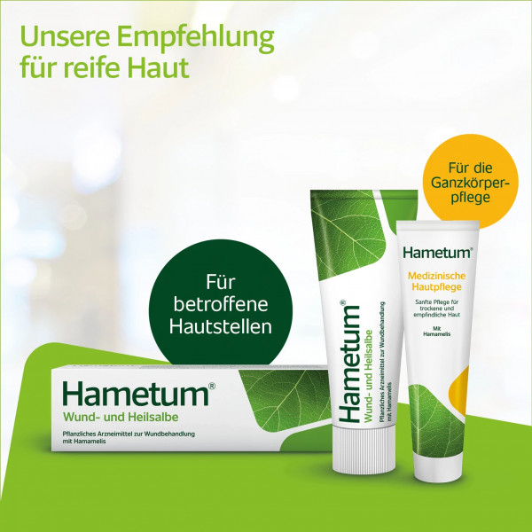 Mit zunehmendem Alter verliert die Haut Feuchtigkeit, sie ist trocken und empfindlich. Die schützende Barrierefunktion der Haut leidet, sie wird durchlässiger, anfälliger für Verletzungen und das Eintreten von Keimen. Ein Zustand, welcher nicht nur kosmetisch störend wirkt, sondern medizinisch relevante Folgen haben kann. Daher ist es bei reifer Haut besonders wichtig, kleine Wunden und kleinflächige Entzündungen schnell zu versorgen und die Wundheilung mit qualitativ hochwertigen Arzneimitteln zu unterstützen. Die Heilsalbe von Hametum® hilft bei leichten Hautverletzungen und fördert somit die Wundheilung, gerade auch bei reifer Haut. Dafür sorgt der pflanzliche Wirkstoff Hamamelis-Destillat. Dieser Wirkstoff aus der Zaubernuss (Hamamelis virginiana) wird mit einer reichhaltigen Salbengrundlage kombiniert, die die reife Haut zusätzlich pflegt und dabei hilft, ihren natürlichen Schutzmantel wiederaufzubauen.