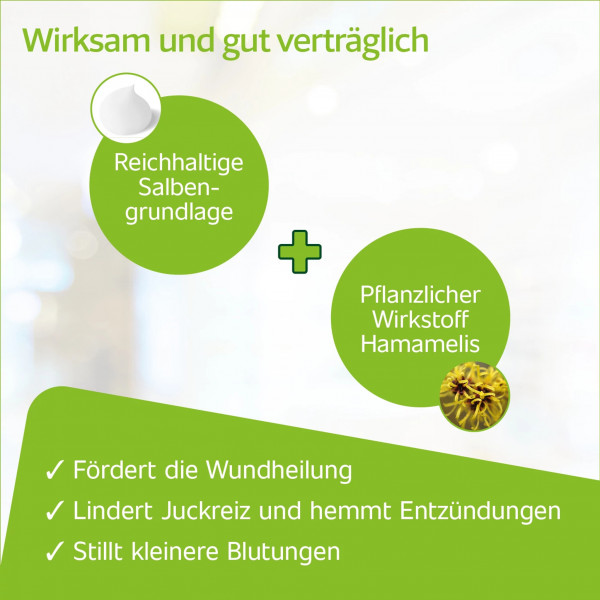 Mit zunehmendem Alter verliert die Haut Feuchtigkeit, sie ist trocken und empfindlich. Die schützende Barrierefunktion der Haut leidet, sie wird durchlässiger, anfälliger für Verletzungen und das Eintreten von Keimen. Ein Zustand, welcher nicht nur kosmetisch störend wirkt, sondern medizinisch relevante Folgen haben kann. Daher ist es bei reifer Haut besonders wichtig, kleine Wunden und kleinflächige Entzündungen schnell zu versorgen und die Wundheilung mit qualitativ hochwertigen Arzneimitteln zu unterstützen. Die Heilsalbe von Hametum® hilft bei leichten Hautverletzungen und fördert somit die Wundheilung, gerade auch bei reifer Haut. Dafür sorgt der pflanzliche Wirkstoff Hamamelis-Destillat. Dieser Wirkstoff aus der Zaubernuss (Hamamelis virginiana) wird mit einer reichhaltigen Salbengrundlage kombiniert, die die reife Haut zusätzlich pflegt und dabei hilft, ihren natürlichen Schutzmantel wiederaufzubauen.