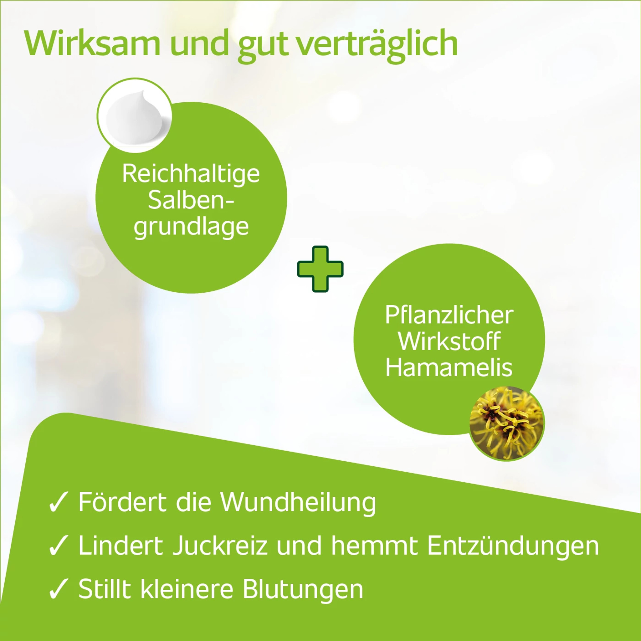 | Wirksubstanz | Hamamelis-Blätter-, -Zweige-Frischdestillat |