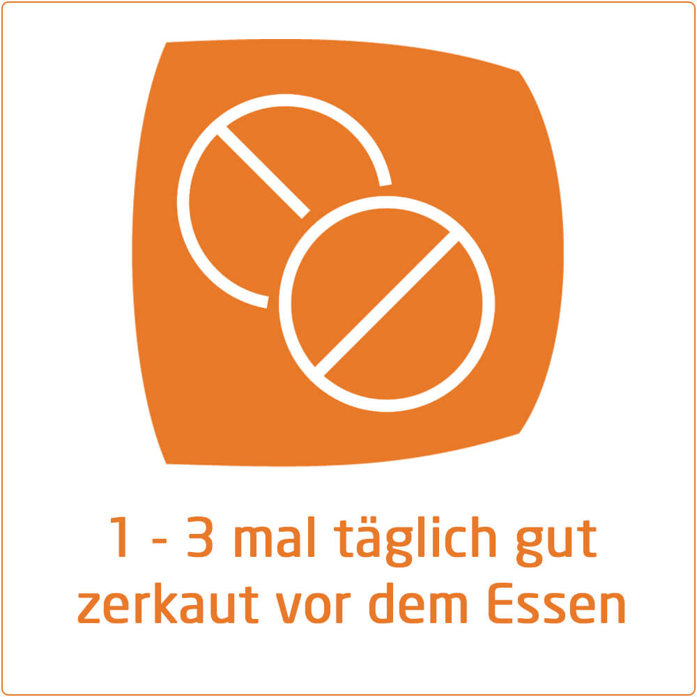 Soweit nicht anders verordnet, ist die übliche Einzeldosis: Für Erwachsene und Kinder ab 12 Jahren: 1 - 2 Tabletten, für Kinder von 6 bis 12 Jahren: 1 Tablette, für Säuglinge und Kleinkinder bis zu 6 Jahren: 1/2 Tablette. Die Tabletten werden 1 - 3 mal täglich gut zerkaut vor dem Essen eingenommen. Säuglinge und Kleinkinder bis zu 3 Jahren erhalten die Tabletten in zerdrückter Form.