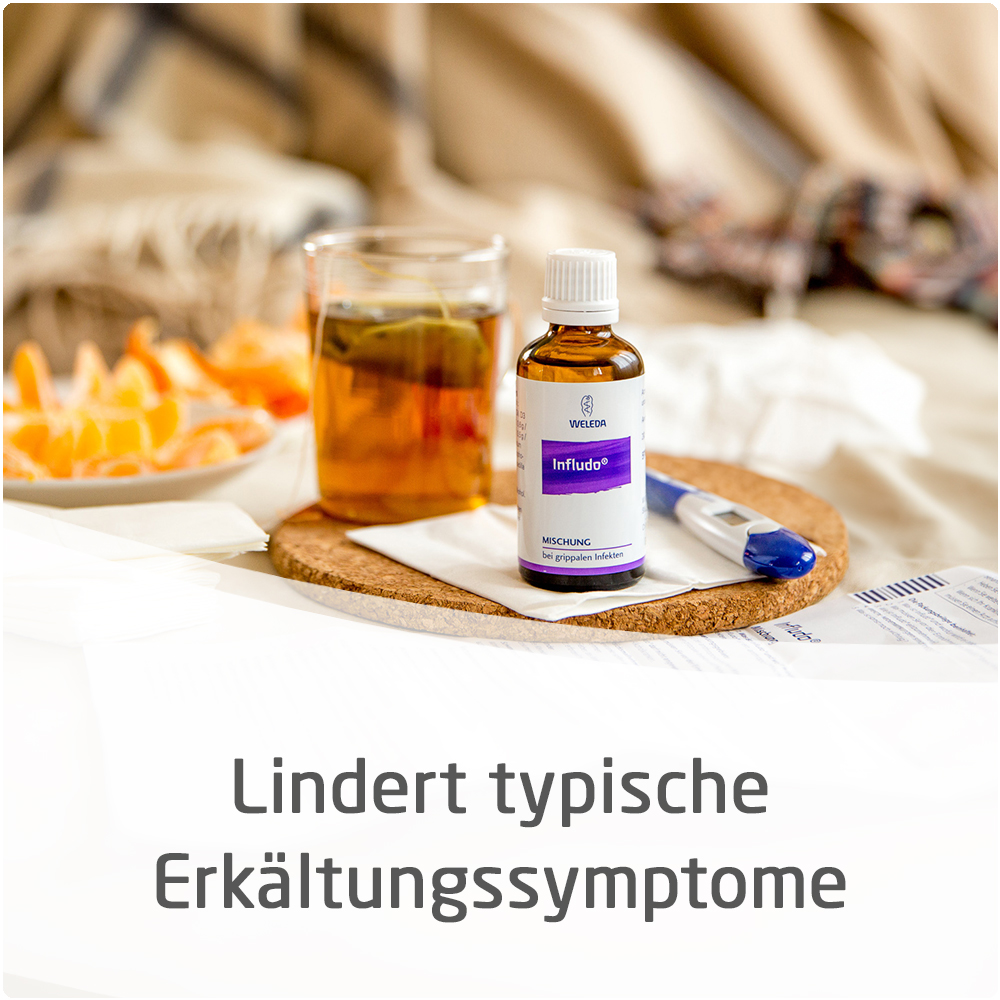 Die Weleda Infludo® Mischung eignet sich zur Stärkung der körpereigenen Abwehrkräfte bei grippalen Infekten. Nach Ausbruch einer Erkältung eingenommen, entfaltet der enthaltene Phosphor in potenzierter Form seine belebende Wirkung im Körper. Er regt die Selbstheilungs- und Wärmekräfte im Körper an, die zur Überwindung der Erkältung beitragen. Gleichzeitig lindern ausgewählte pflanzliche Zubereitungen akute Beschwerden: Eisenhut lindert erkältungsbedingte Kopf- und Gliederschmerzen und reguliert bei Fieber die Körpertemperatur. Zaunrübe und Wasserhanf harmonisieren den Flüssigkeitsorganismus, der sich in vermehrter Schleimbildung zeigt. So unterstützt Infludo® die Heilung und den Genesungsprozess.