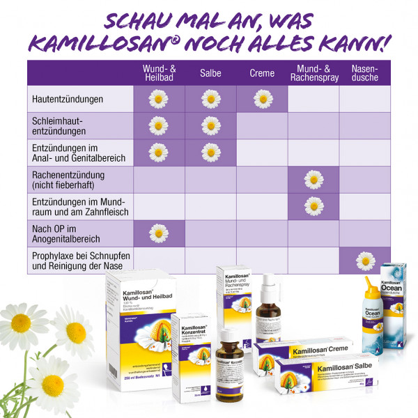 Der Extrakt und das Öl aus der Kamillenblüte haben eine entzündungshemmende, antibakterielle und wundheilungsfördernde Wirkung.