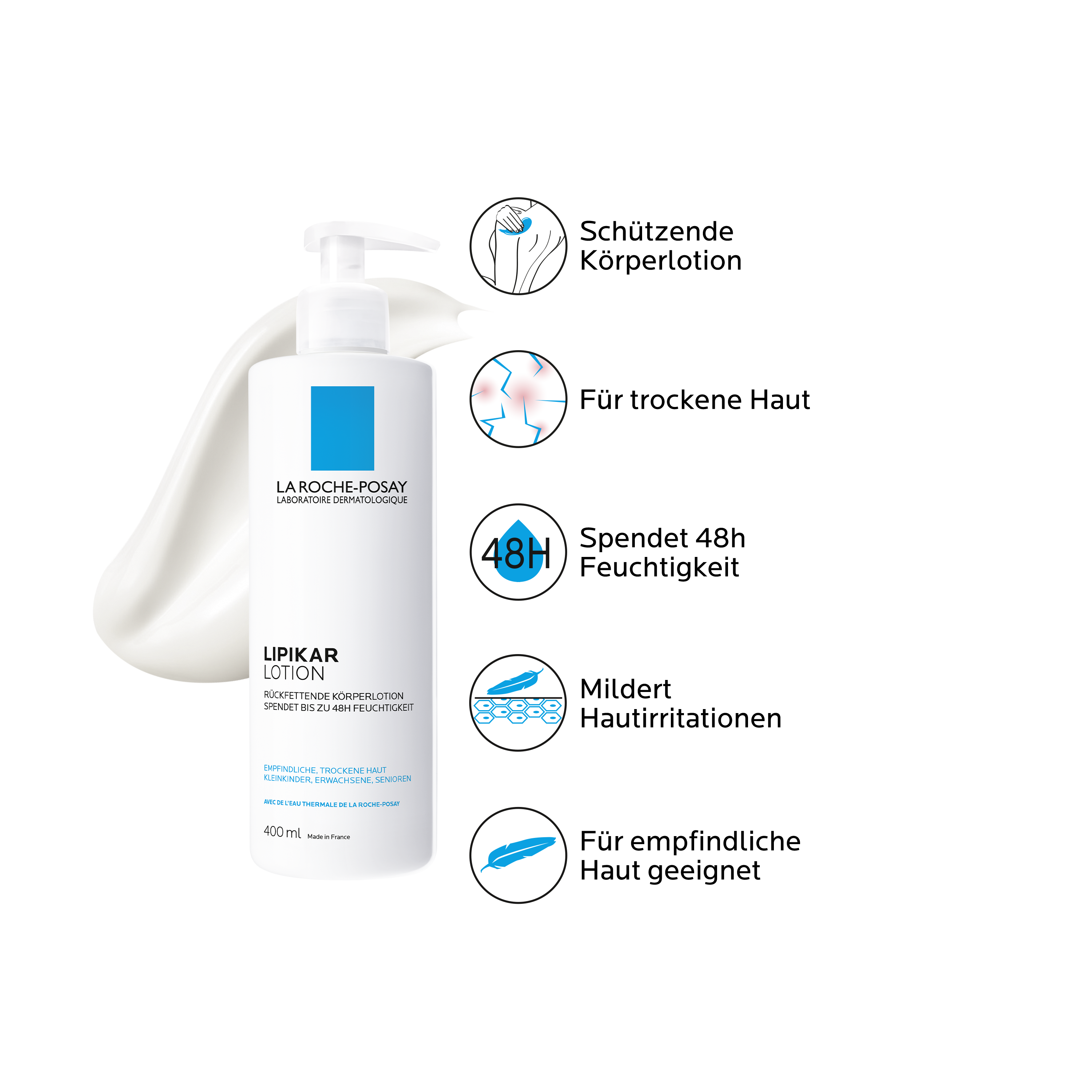 Die Pflege für die ganze Familie: LIPIKAR LOTION mit regenerierendem Thermalwasser aus La Roche-Posay. Durch ihre spezielle Formel schützt die LIPIKAR LOTION empfindliche und trockene Haut vor dem Austrocknen und spendet bis zu 48 Stunden Feuchtigkeit. Da die Formulierung nur ein Minimum an ausgewählten Inhaltsstoffen beinhaltet, ist sie auch bei sehr empfindlicher Haut gut verträglich. Die cocoonartige Textur der Cold Cream schützt vor dem Austrocknen. Niacinamid mildert Hautirritationen und das Spannungsgefühl der Haut, während Sheabutter rückfettend wirkt und die Haut geschmeidig hält. Die dezent duftende und schnell einziehende Textur der LIPIKAR LOTION fettet und klebt nicht.