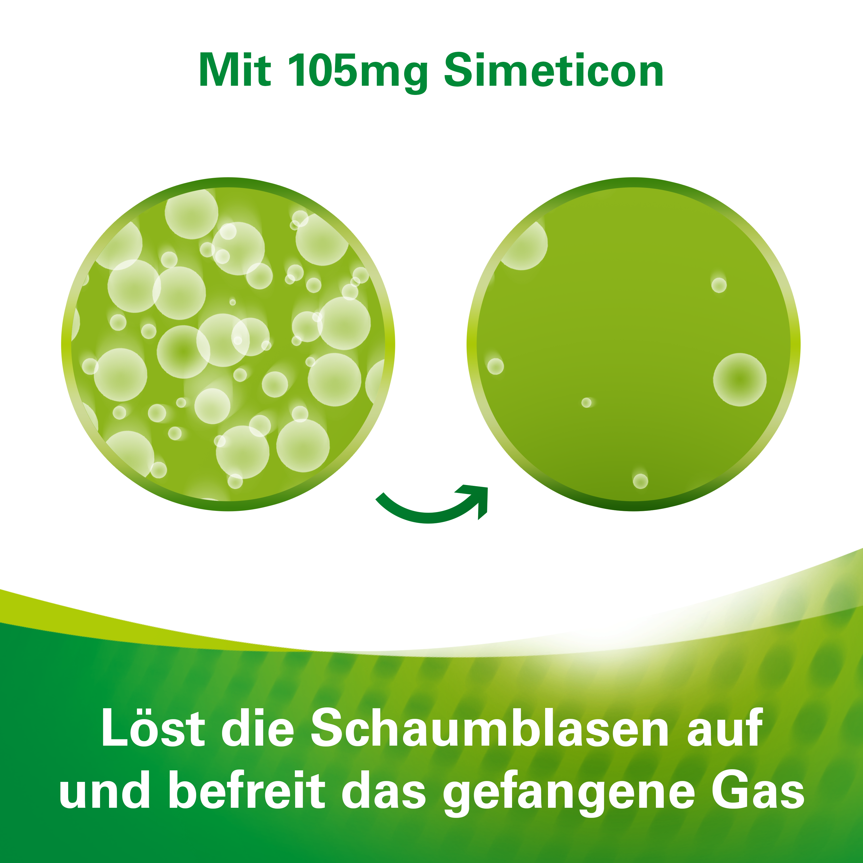 Während der Verdauung können kleine Gasbläschen entstehen, die für einen unangenehmen Blähbauch sorgen können. Um die Bläschen aufzulösen, kann ihre Oberflächenbeschaffenheit verändert werden. An dieser Stelle setzt die gut verträgliche, entschäumend wirkende Substanz Simeticon an, die in Lefax® enthalten ist. Mit Lefax® extra zerfallen die Bläschen, die Luft wird befreit und kann auf natürlichem Weg entweichen.