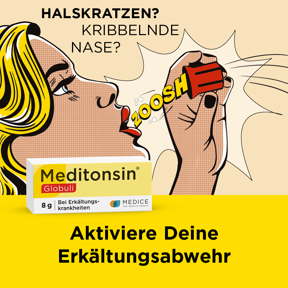 Doch auch bei akuten Symptomen wie Halsschmerzen, Husten oder Schnupfen ist Meditonsin® geeignet, um die Beschwerden zu lindern und den grippalen Infekt weniger unangenehm verlaufen zu lassen.