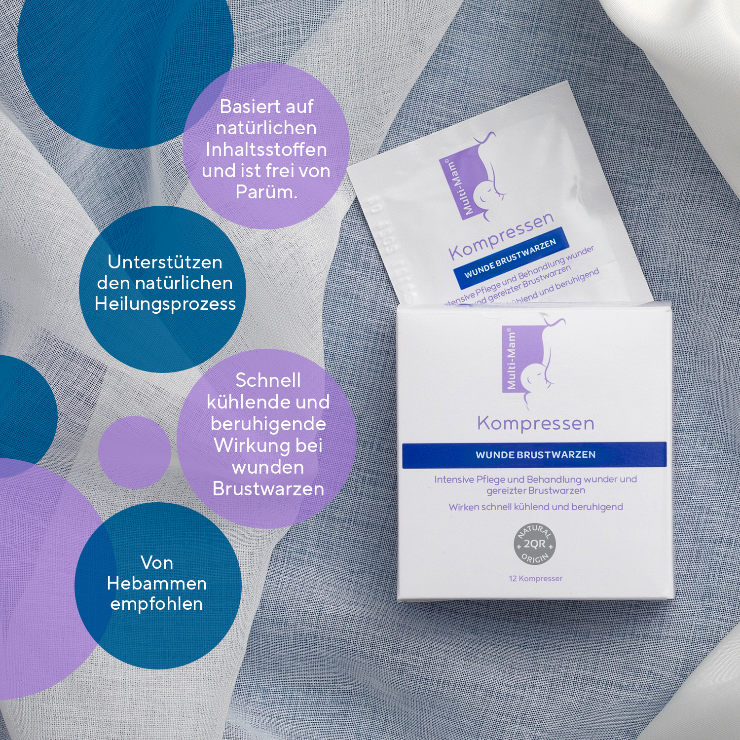 Multi-Mam Kompressen bestehen aus einem weichen, schützenden Baumwoll-Pad, das mit einem bio-aktiven Gel getränkt ist.