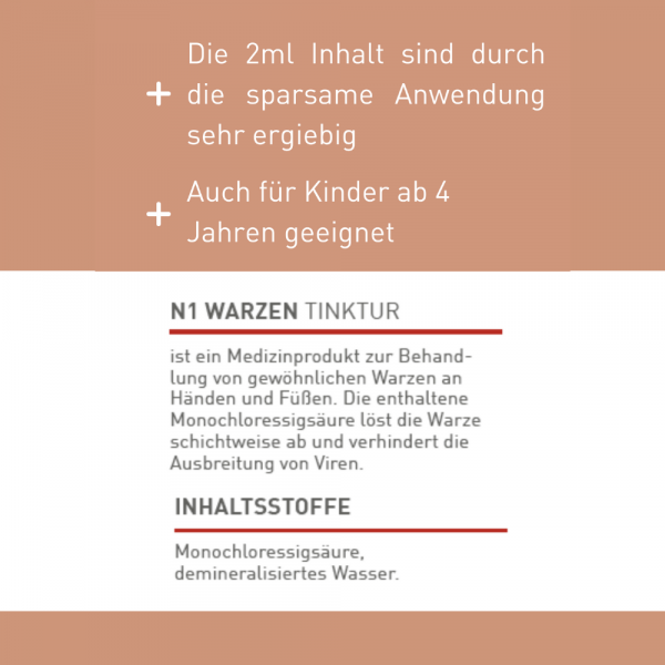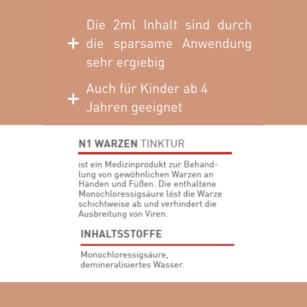 Die Tinktur enthält Monochloressigsäure, ein Stoff, der auf der Haut eine ablösende Wirkung hat. Das Betupfen der Warze ist nicht schmerzhaft und daher auch für Kinder ab 4 Jahren gut geeignet (wenn korrekt von einem Erwachsenen aufgetragen). Die Warze löst sich Schicht für Schicht ab. Die Flüssigkeit braucht eine Woche, um die obere Hautschicht aufzuweichen. Du siehst also nicht gleich nach dem Auftragen ein Ergebnis. Nach einiger Zeit werden die Warzenzellen zerstört, die Warze wird weiß und wird abgestoßen. Wirksamkeit klinisch bestätigt: Die N1 Warzen Tinktur ist ein hochwirksames und erprobtes Medizinprodukt für Erwachsene und Kinder ab 4 Jahren. Die 2 ml Inhalt sind durch die sparsame Anwendung sehr ergiebig.