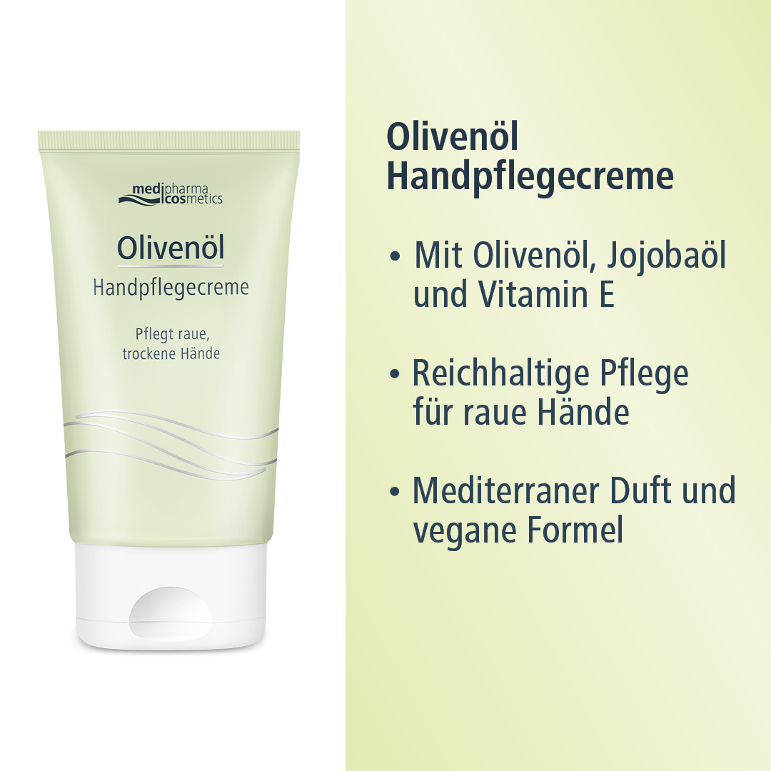 Die Olivenöl Handpflegecreme von medipharma cosmetics wurde für die speziellen Pflegebedürfnisse von rauen, trockenen Händen entwickelt. Sie enthält kaltgepresstes Olivenöl und hautpflegendes Jojobaöl, welche die Haut vor dem Austrocknen schützen und sie zart und geschmeidig pflegen. Die Hände fühlen nach der Anwendung zart und gepflegt an. Zurück bleibt ein geschmeidiges Hautgefühl und der mediterrane Duft unserer beliebten Olivenöl Pflegeserie.