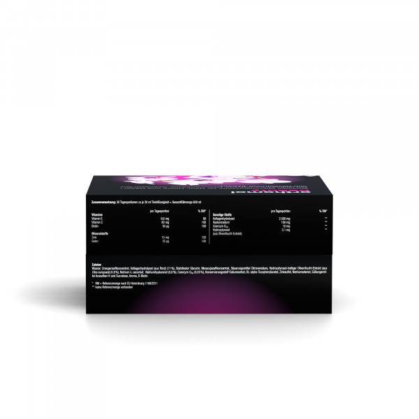 Natrium ascorbat, Kollagen-Hydrolysat vom Rind, Hyaluronsäure. Natriumsalz, Wasser. gereinigtes, Apfelsinenfruchtsaft-Konzentrat, Glycerol, Ascorbinsäure, Citronensäure, Kalium sorbat, Acesulfam kalium, Sucralose, Aromastoffe. natürlich. naturidentisch, DL-α-Tocopherol acetat, DL-α-Tocopherol, Biotin, Coenzym R, Vitamin B7, Vitamin H, Zink-Ion