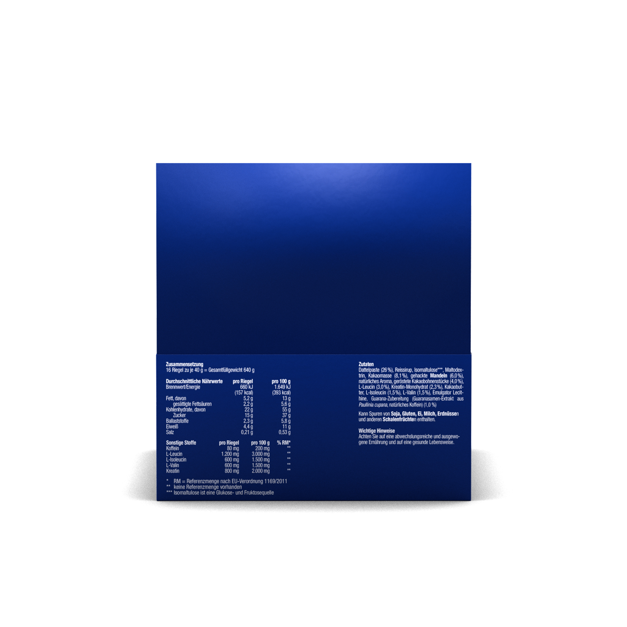 Datteln (41 %), Apfelpaste (Apfelsaftkonzentrat, Apfelpüreekonzentrat) (15 %), gehackte Mandeln (8 %), Isomaltulose*, Kakaomasse, Reismehl, Citrusfaser, L-Leucin (3,3 %), Kreatinmonohydrat (2,5 %), L-Arginin (2,2 %), Kakaobutter, L-Isoleucin (1,7 %), L-Valin (1,7 %), Guarana-Extrakt mit Koffein (1 %) (aus Paullinia cupana), Glucosaminhydrochlorid (0,8 %), Säuerungsmittel Citronensäure, Chondroitinsulfat (0,4 %), natürliches Aroma, Natriumhyaluronat (0,05 %).