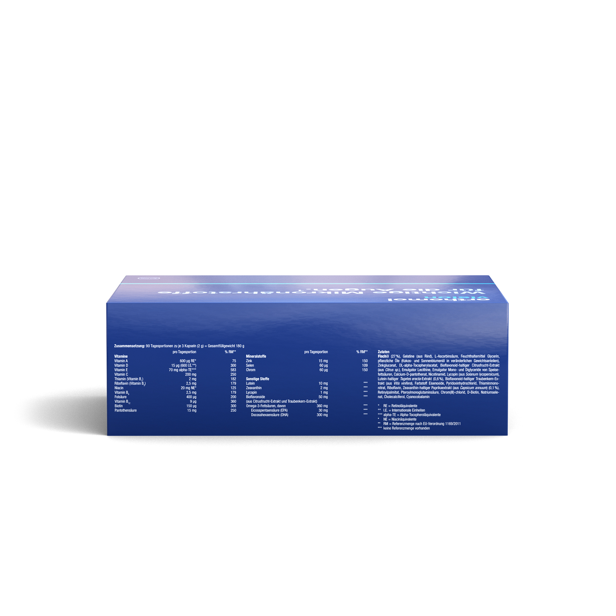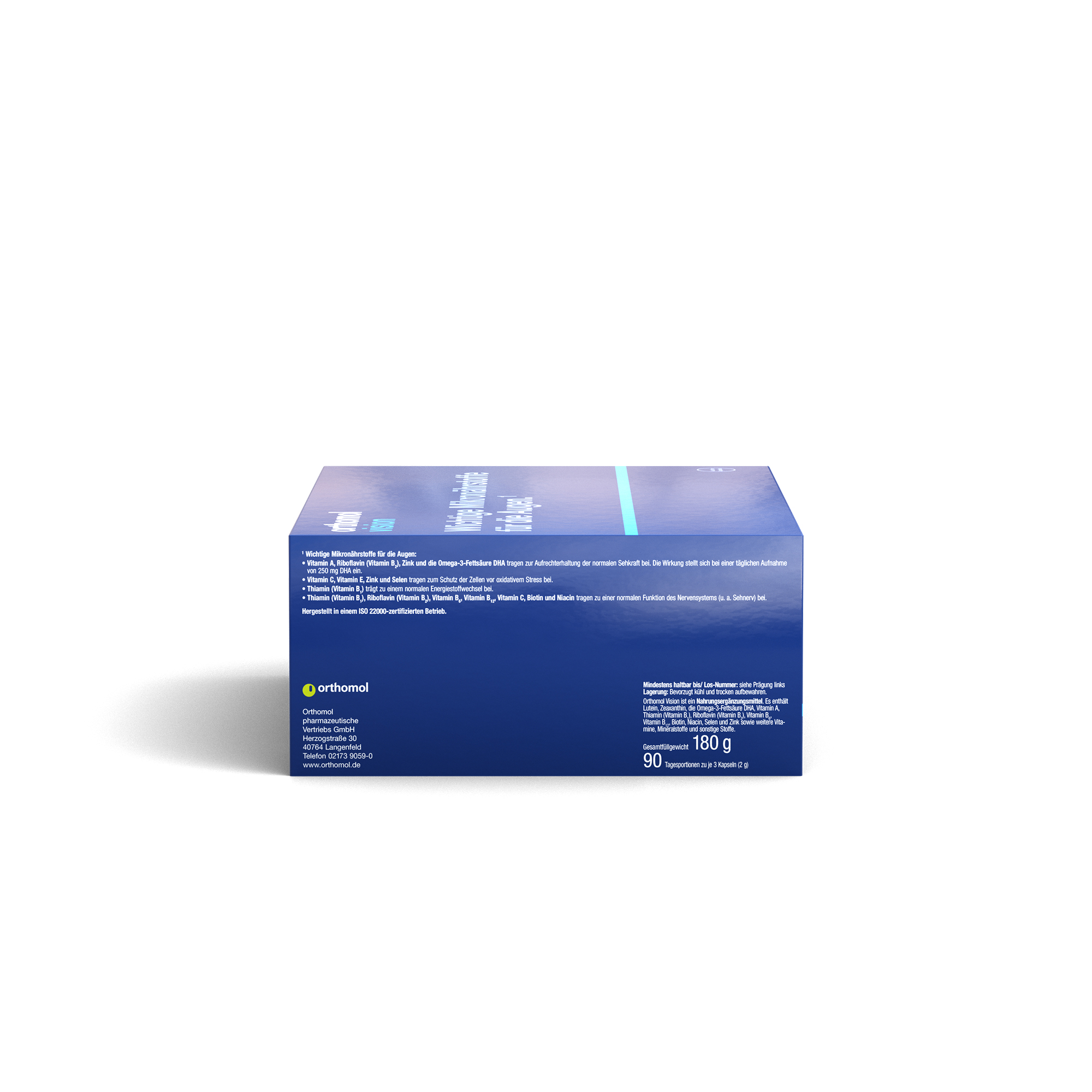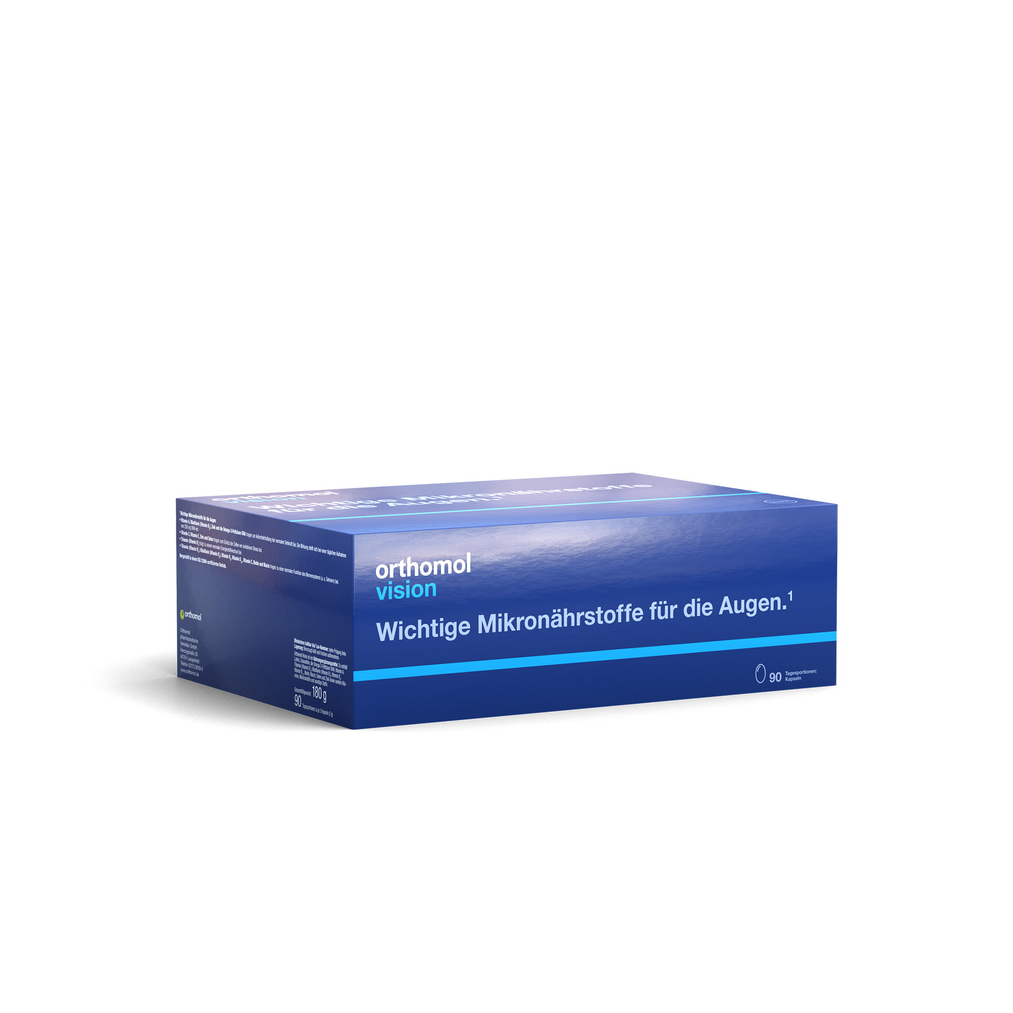 Orthomol Vision ist ein Nahrungsergänzungsmittel. Wichtige Mikronährstoffe für die Augen. Mit Vitamin A, Vitamin B2 (Riboflavin), Zink und der Omega-3-Fettsäure DHA zur Aufrechterhaltung der normalen Sehkraft. Mit Lutein und Zeaxanthin.